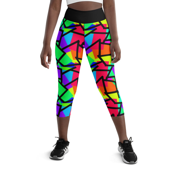 Colorful and Harajuku aesthetic womens yoga capri leggings with high elastic waistband in black and mid-calf in length. Geometric rainbow and black neoncore design in a unique neo vintage 80s Memphis style design. These unique leggings for women are perfect as festival meggings, gym leggings, rave leggings, running tights or as part of your streetwear fashion. Yami Kawaii style that will get you noticed.