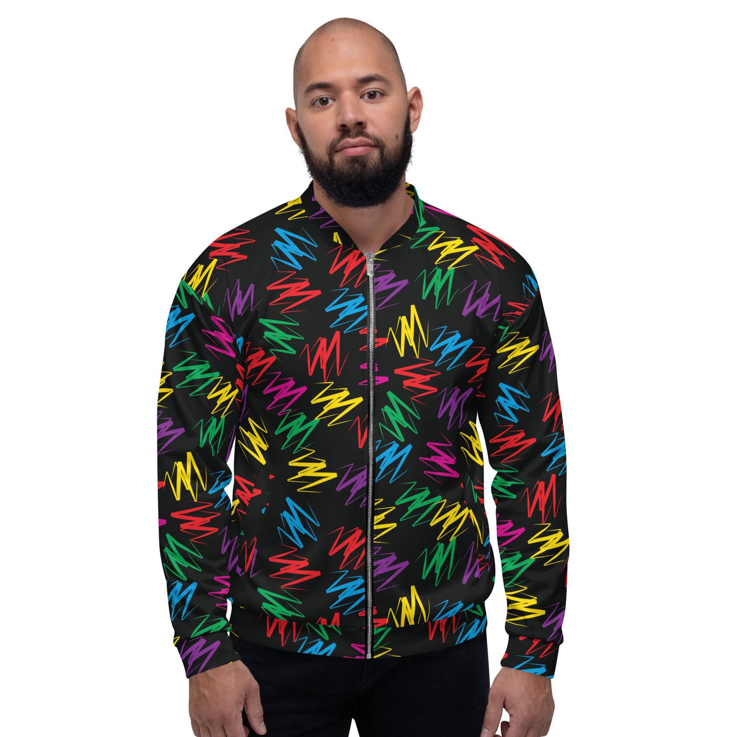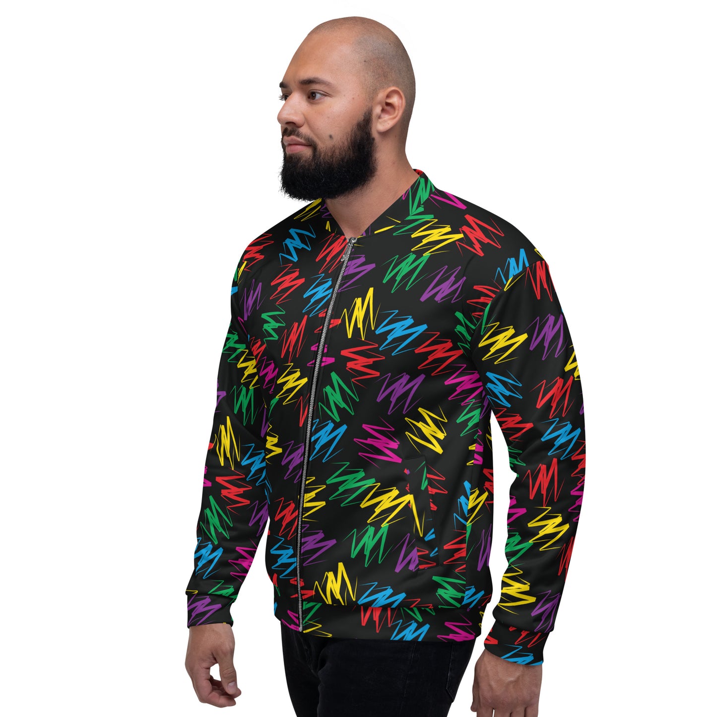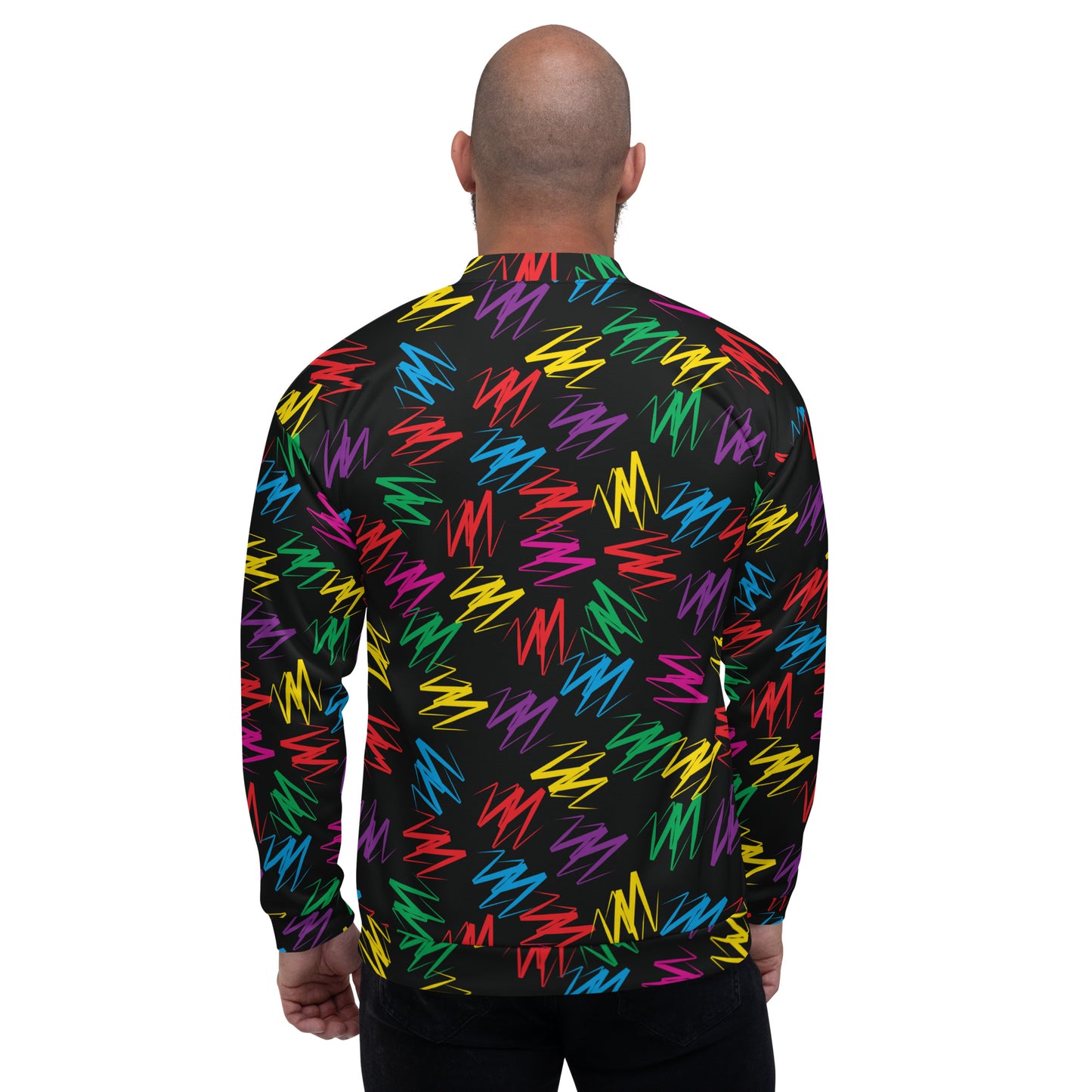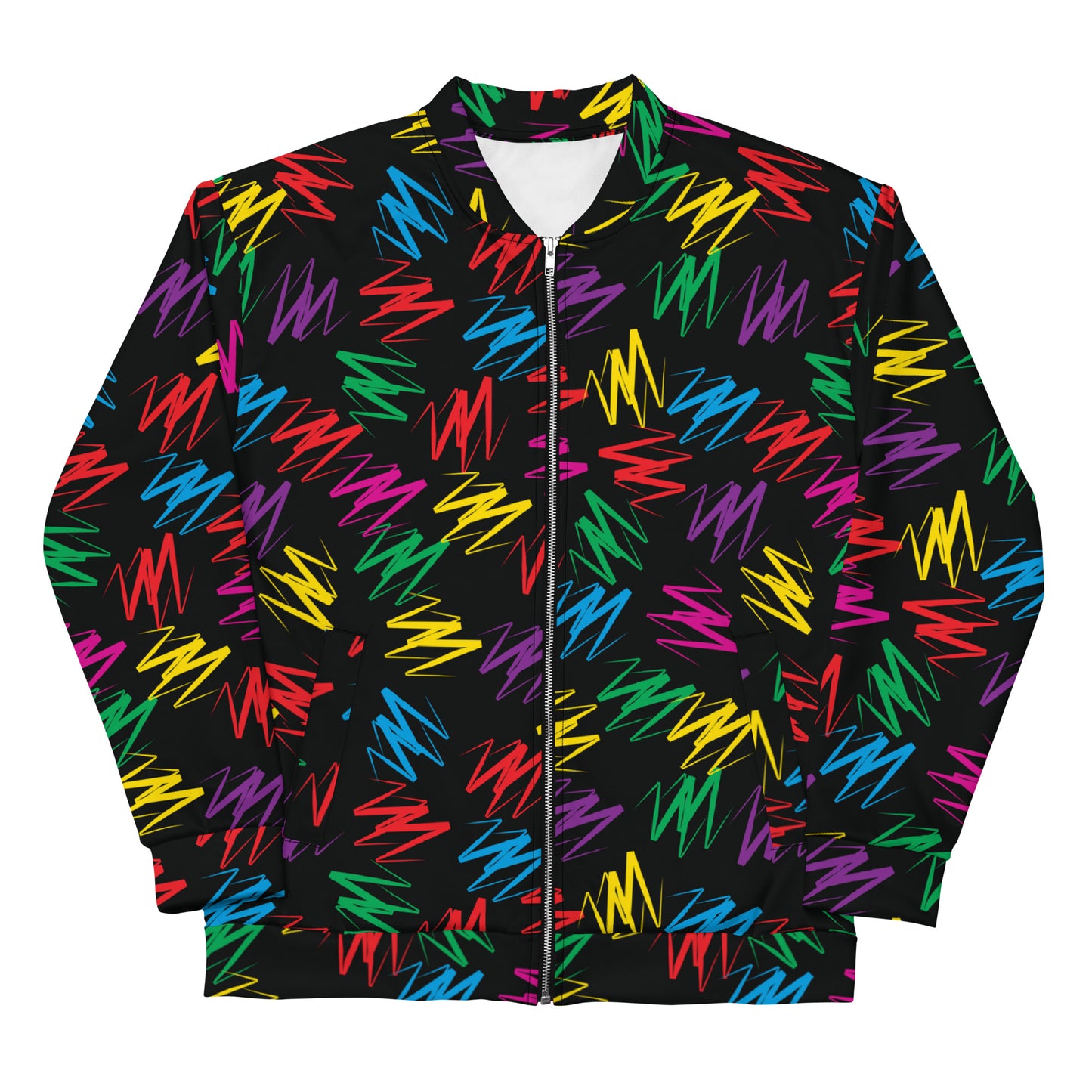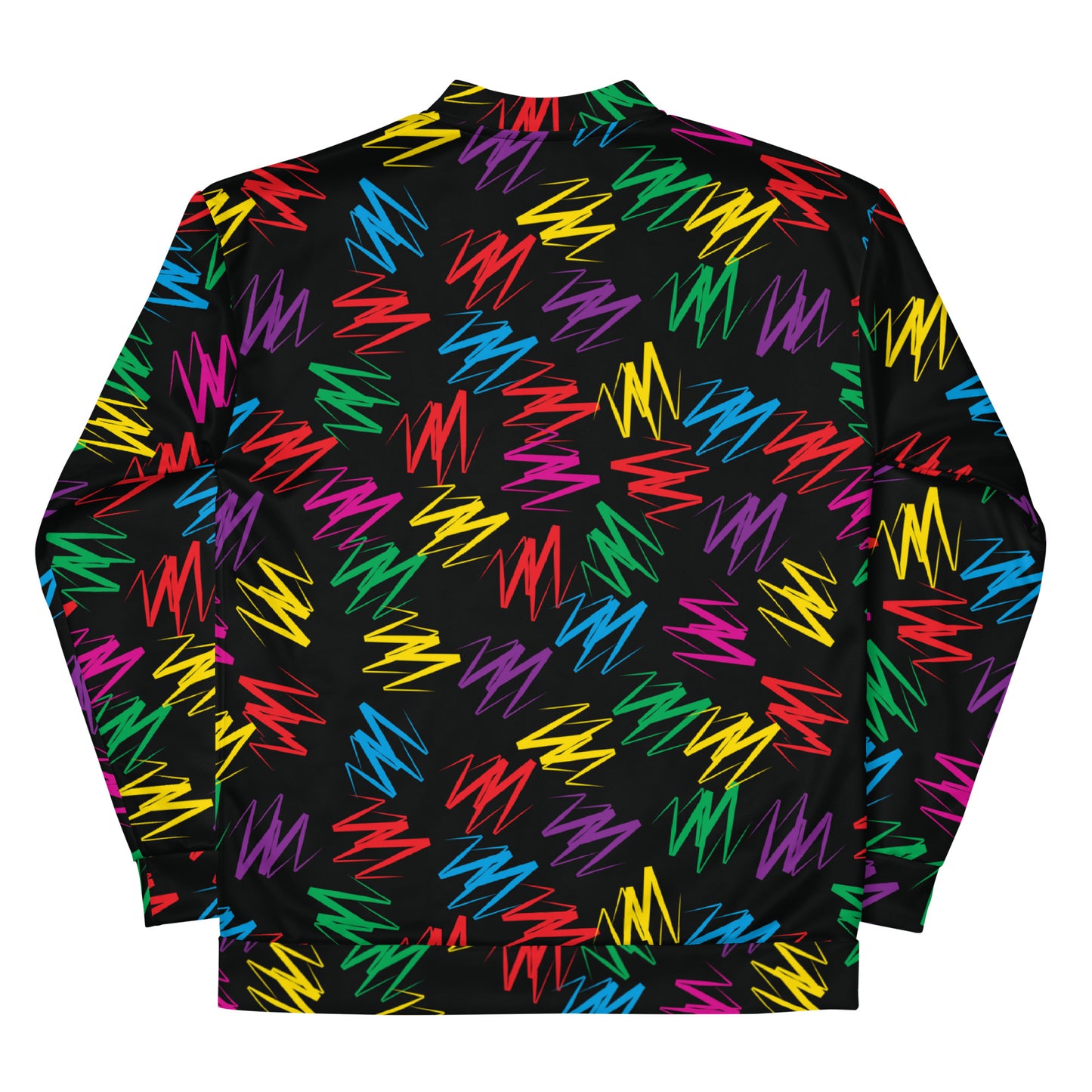 Lustige Bomberjacke im Retro-Stil der 80er Jahre, Memphis & Neoncore. Schwarze Jacke mit bunten Zickzackmustern. Passend für die Größen 2XS bis 6XL. Normale Passform wie ein Hawaiihemd. Hergestellt aus recyceltem Material.