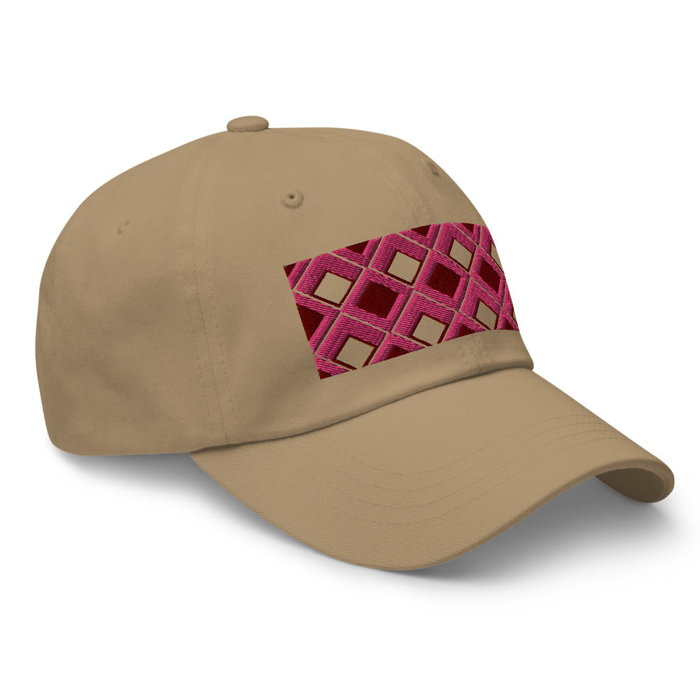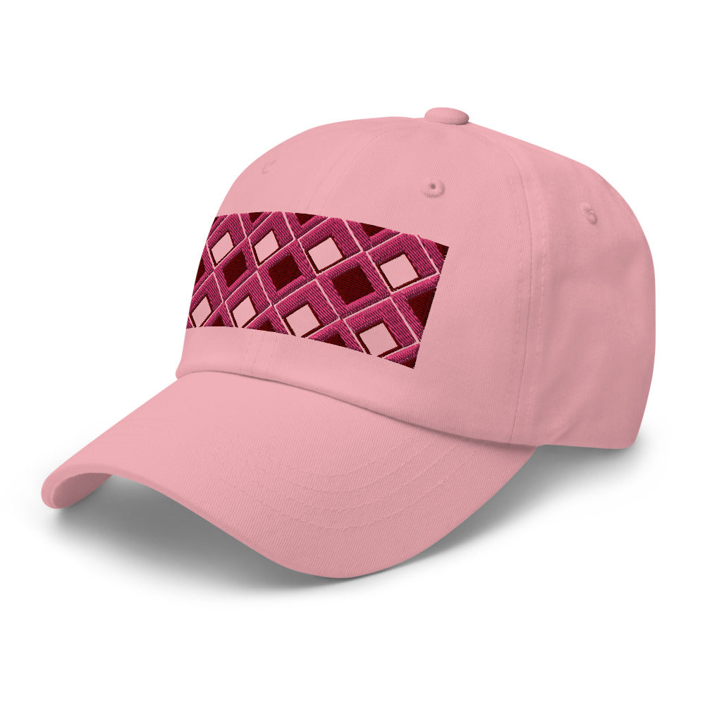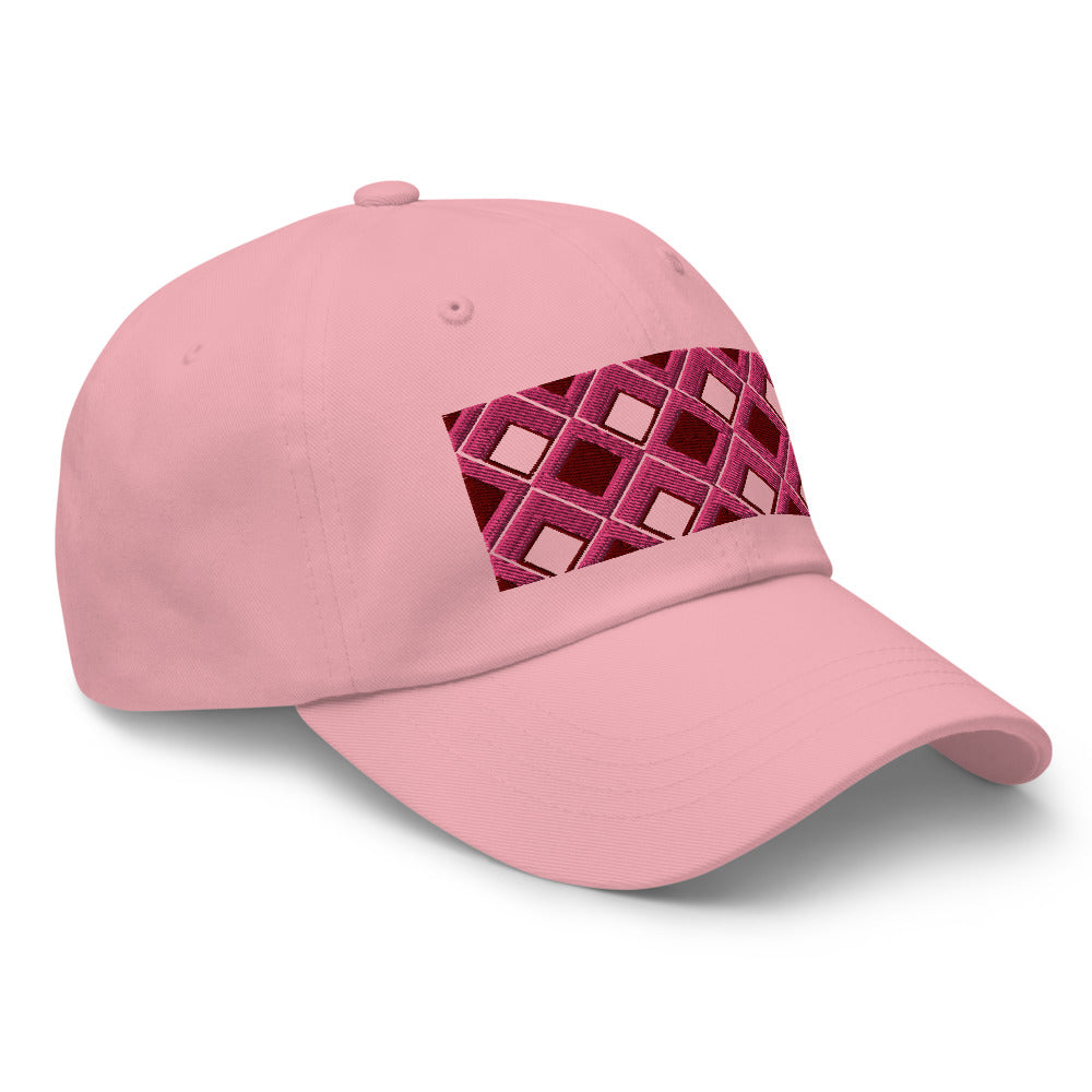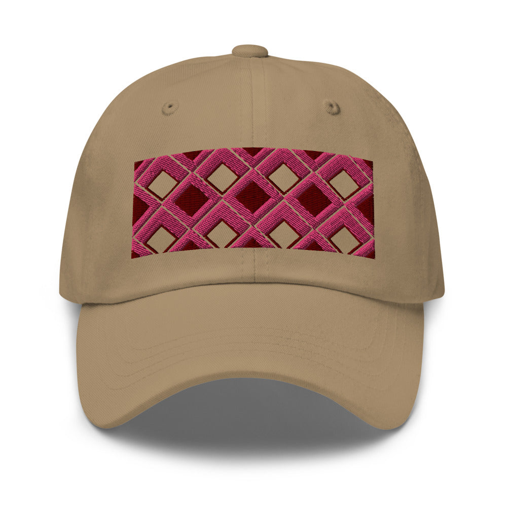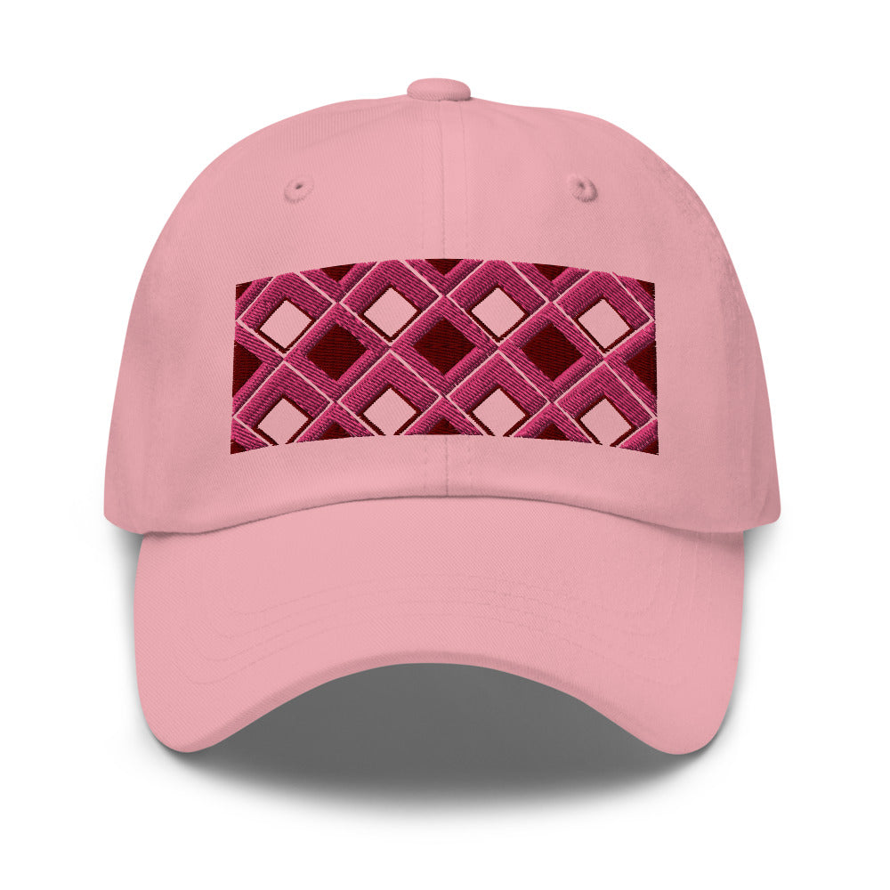 Tragen Sie den Retro-Look mit dieser fantastischen rosafarbenen Dad-Mütze im Vintage-Stil der 60er und Mid-Century Modern aus unserer Geometric Glam Collection mit farbenfrohem Rautenmuster. Dieses farbenfrohe, luxuriös anmutende Logo im Retro-Stil der 60er hat ein mehrfarbiges geometrisches Rautenmuster, das von Grafikdesignern der 1950er und 1960er Jahre wie Paul Rand, Saul Bass und Alexander Girard inspiriert wurde. Verströmt diese so wichtige Vintage-Lebendigkeit, wo immer Sie auch hingehen. Diese Unisex-Dad-Mütze ist definitiv abgefahrener Street-Chic, den Sie tragen möchten.