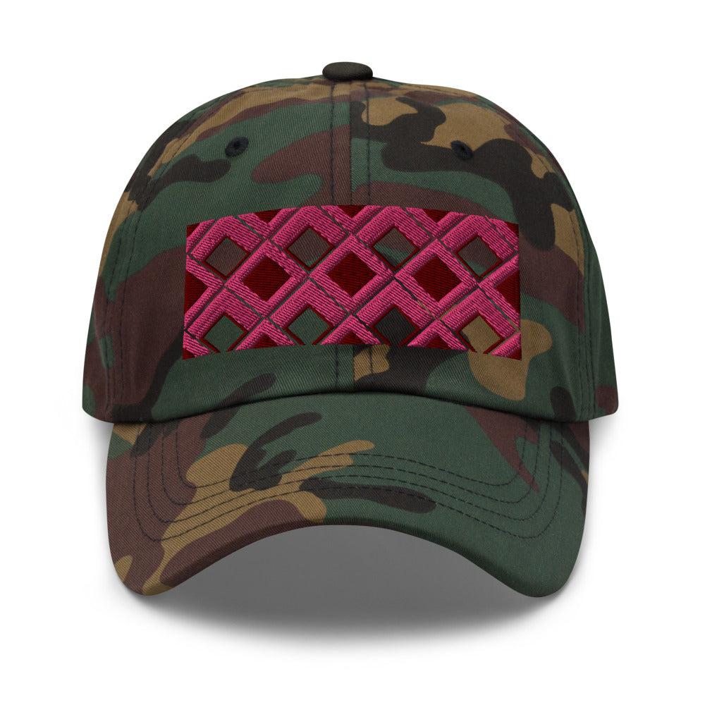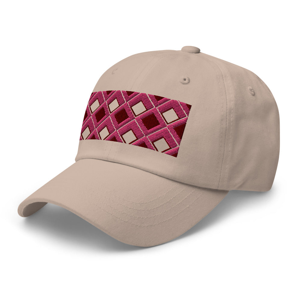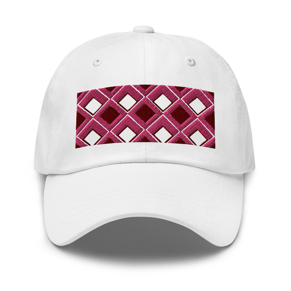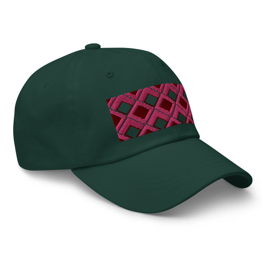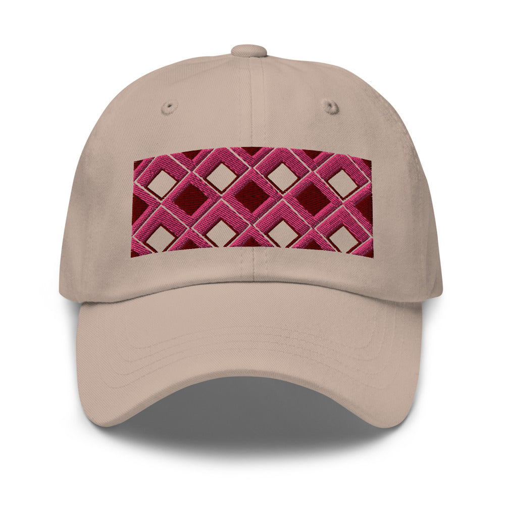 Tragen Sie den Retro-Look mit dieser fantastischen rosafarbenen Dad-Mütze im Vintage-Stil der 60er und Mid-Century Modern aus unserer Geometric Glam Collection mit farbenfrohem Rautenmuster. Dieses farbenfrohe, luxuriös anmutende Logo im Retro-Stil der 60er hat ein mehrfarbiges geometrisches Rautenmuster, das von Grafikdesignern der 1950er und 1960er Jahre wie Paul Rand, Saul Bass und Alexander Girard inspiriert wurde. Verströmt diese so wichtige Vintage-Lebendigkeit, wo immer Sie auch hingehen. Diese Unisex-Dad-Mütze ist definitiv abgefahrener Street-Chic, den Sie tragen möchten.