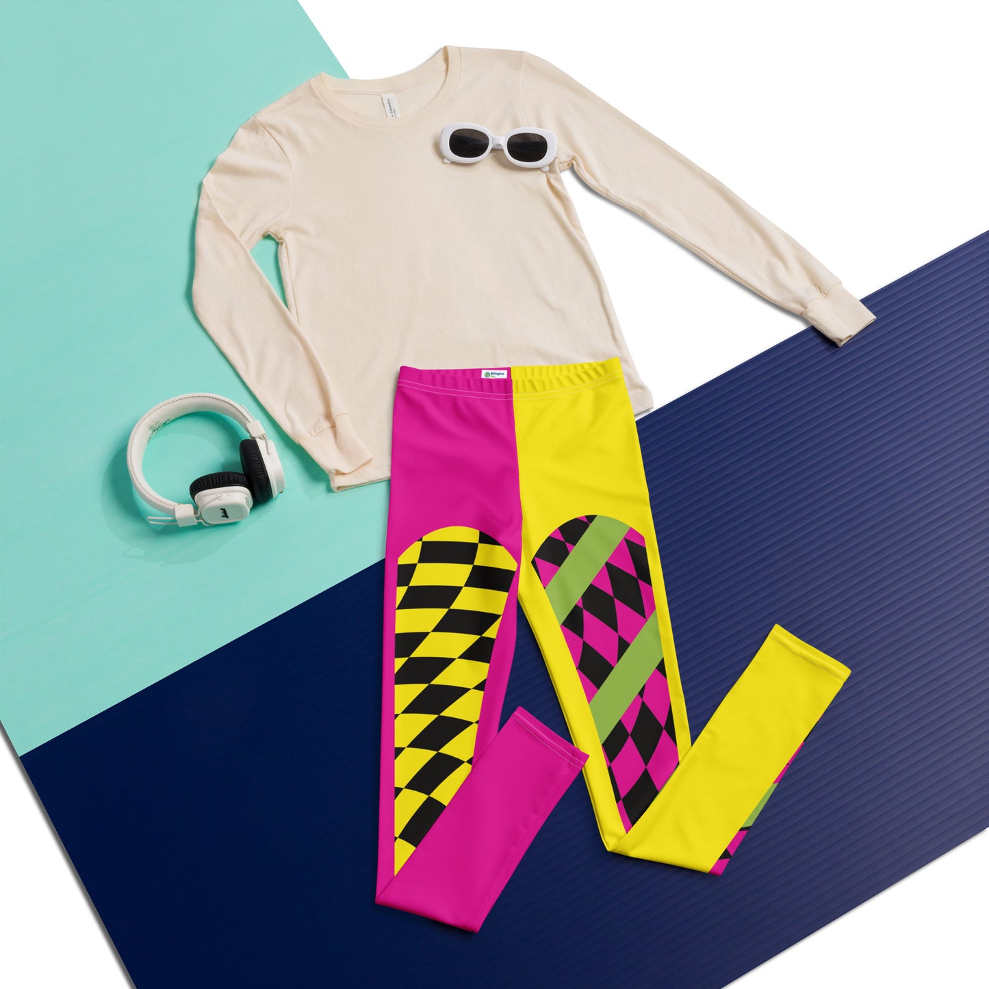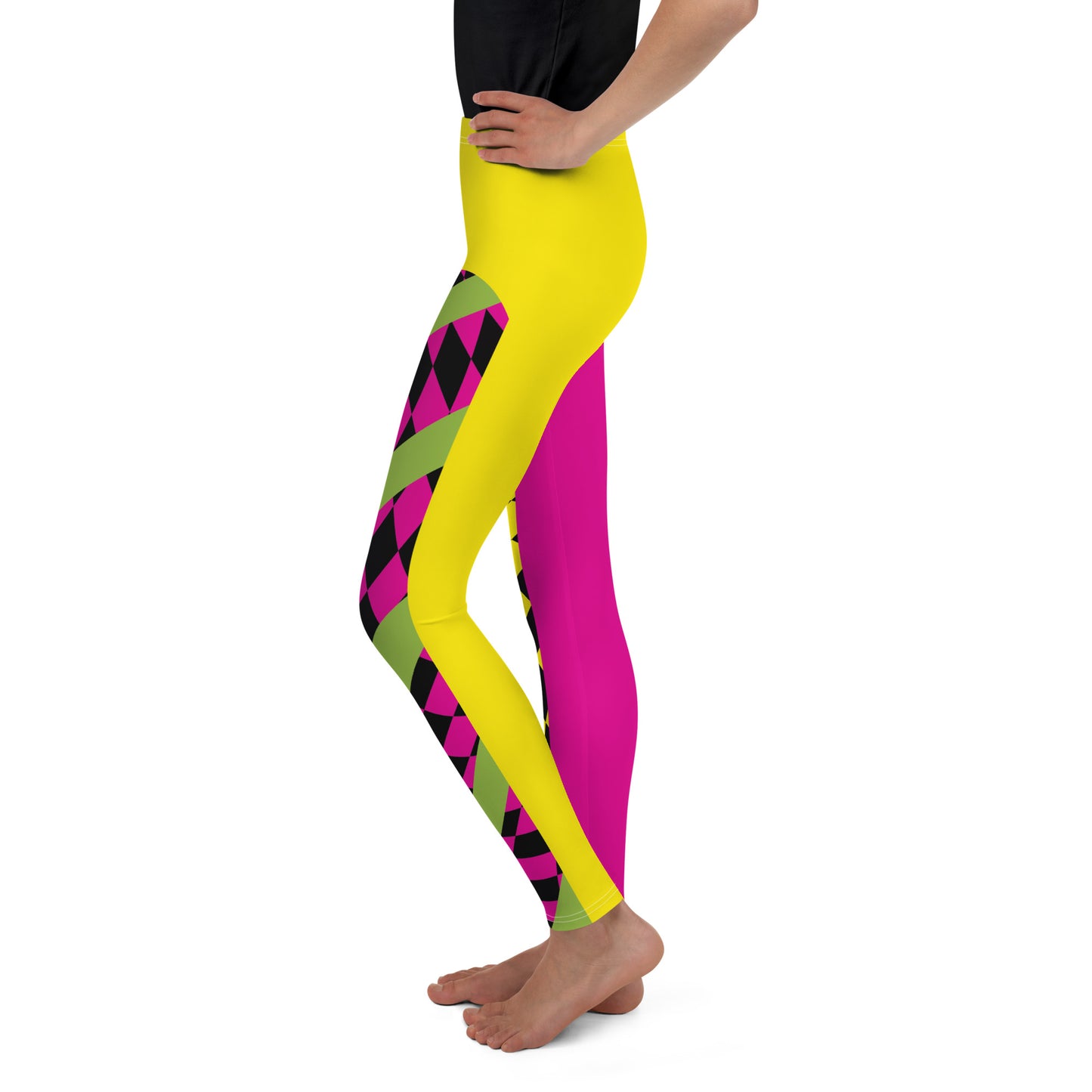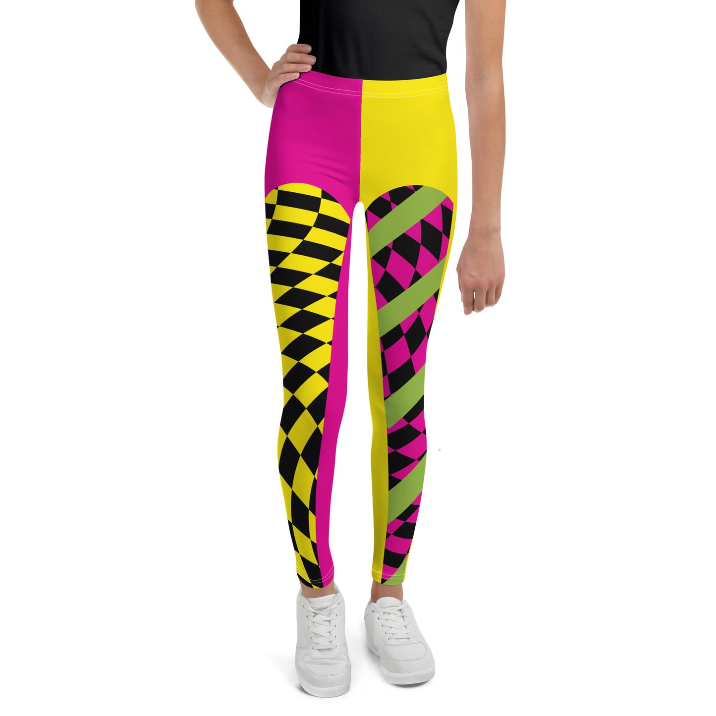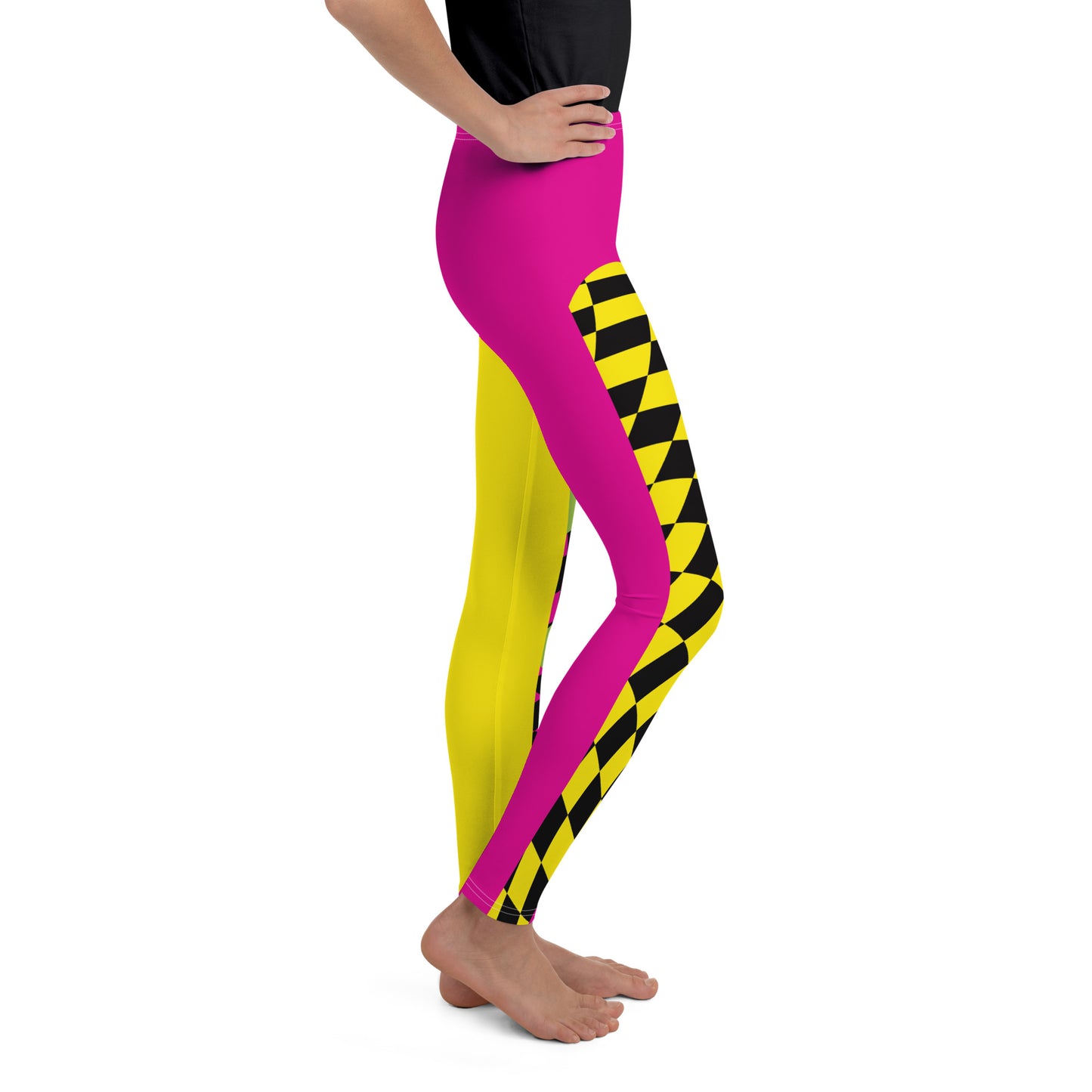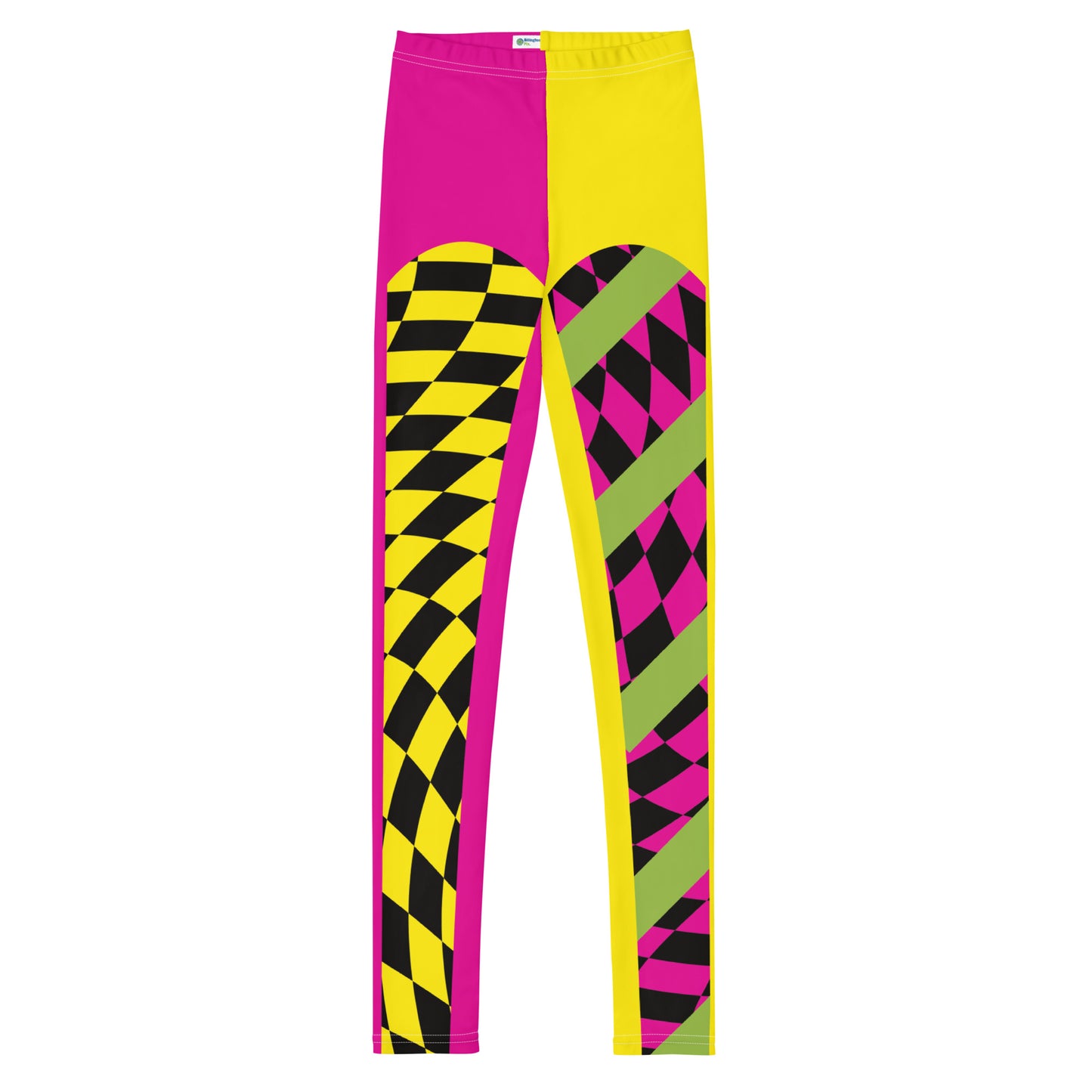 Leggings de estilo retro inspirados en la lucha libre profesional, disponibles en tallas para jóvenes, adolescentes y niños. Mallas sin pies en vibrantes tonos rosa y amarillo, ideales para lucha libre escolar, MMA, clases de baile, ballet, gimnasia y otros deportes visuales. También perfectas para cosplay, disfraces, fiestas y Halloween. Diseño a cuadros en la parte delantera de cada pierna. Cintura elástica de tiro medio y largo hasta el tobillo. Estas leggings tienen un calce estándar.