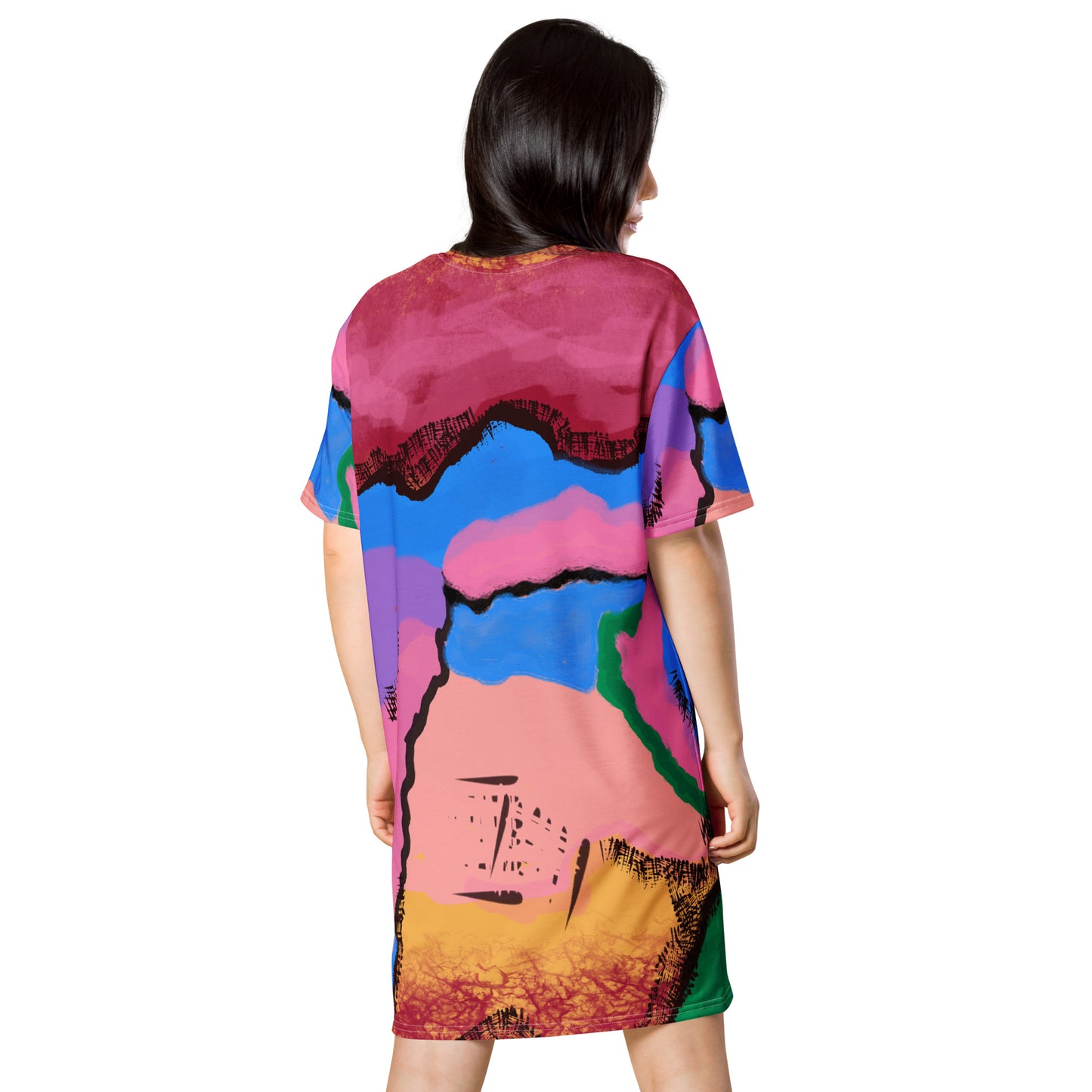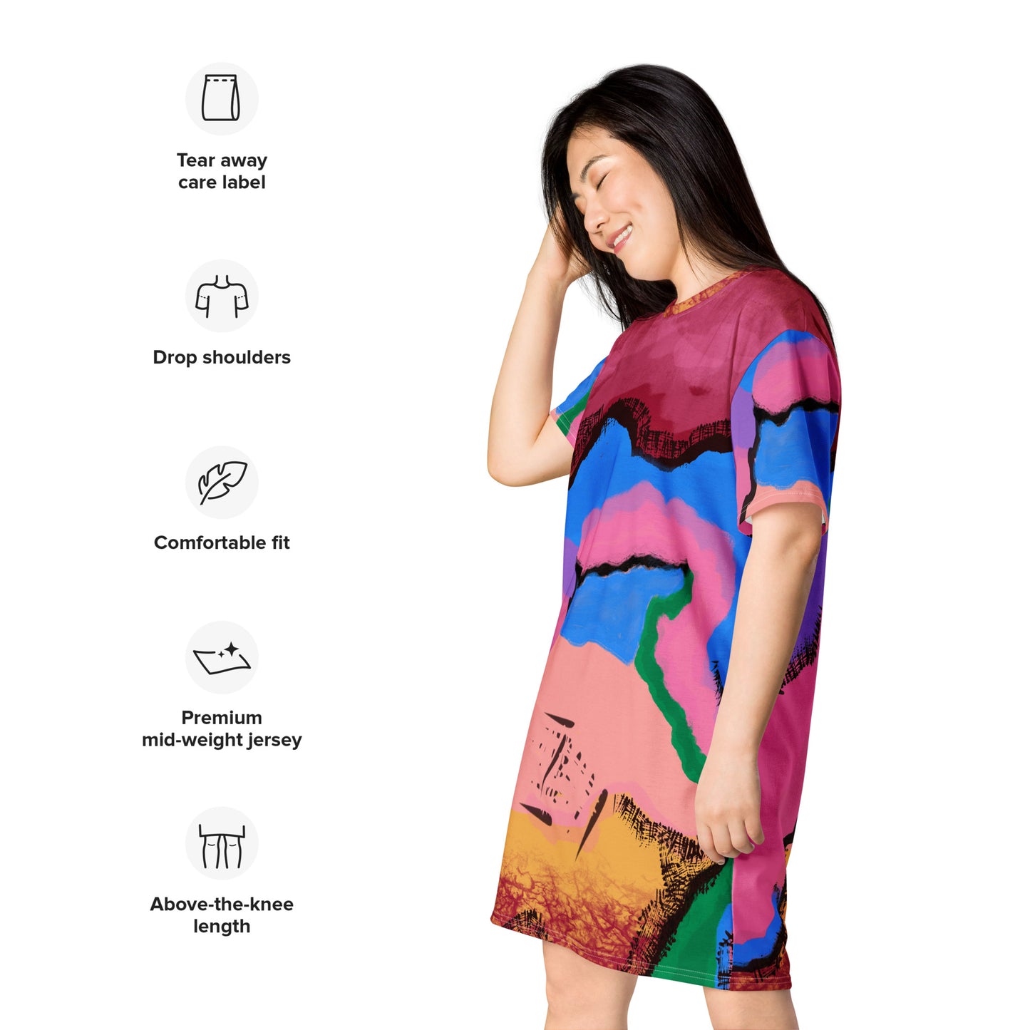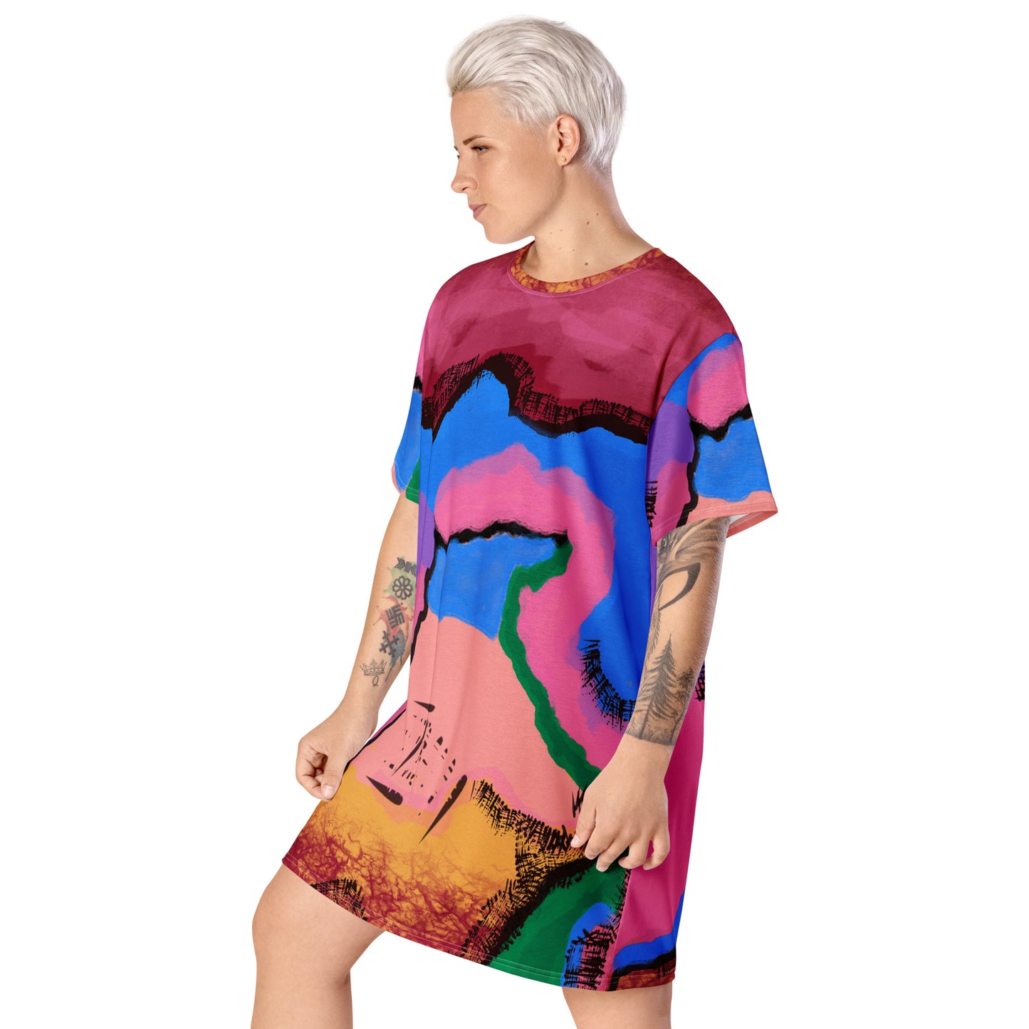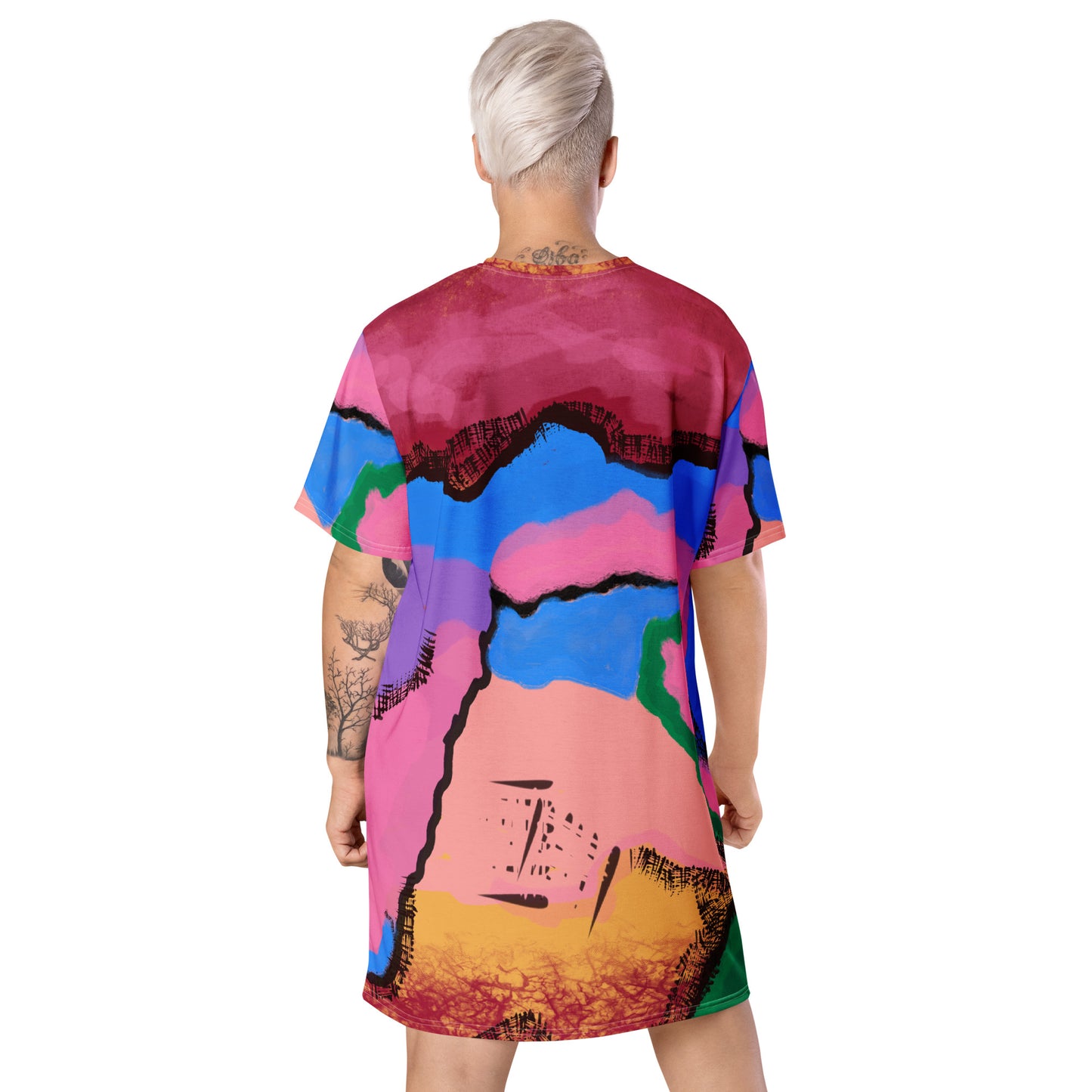 Fun and wonderfully eccentric abstract art t-shirt dress. With color blocks of orange, pink, blue and green with splashes of black in a textured and patterned design. The stretchy and smooth fabric keeps its color and means that this shirtdress is versatile for dancing, clubbing, Christmas parties or as Harajuku fashion, street, festival or rave wear. This dress tee is popping and is the perfect look for the self-expressive person.