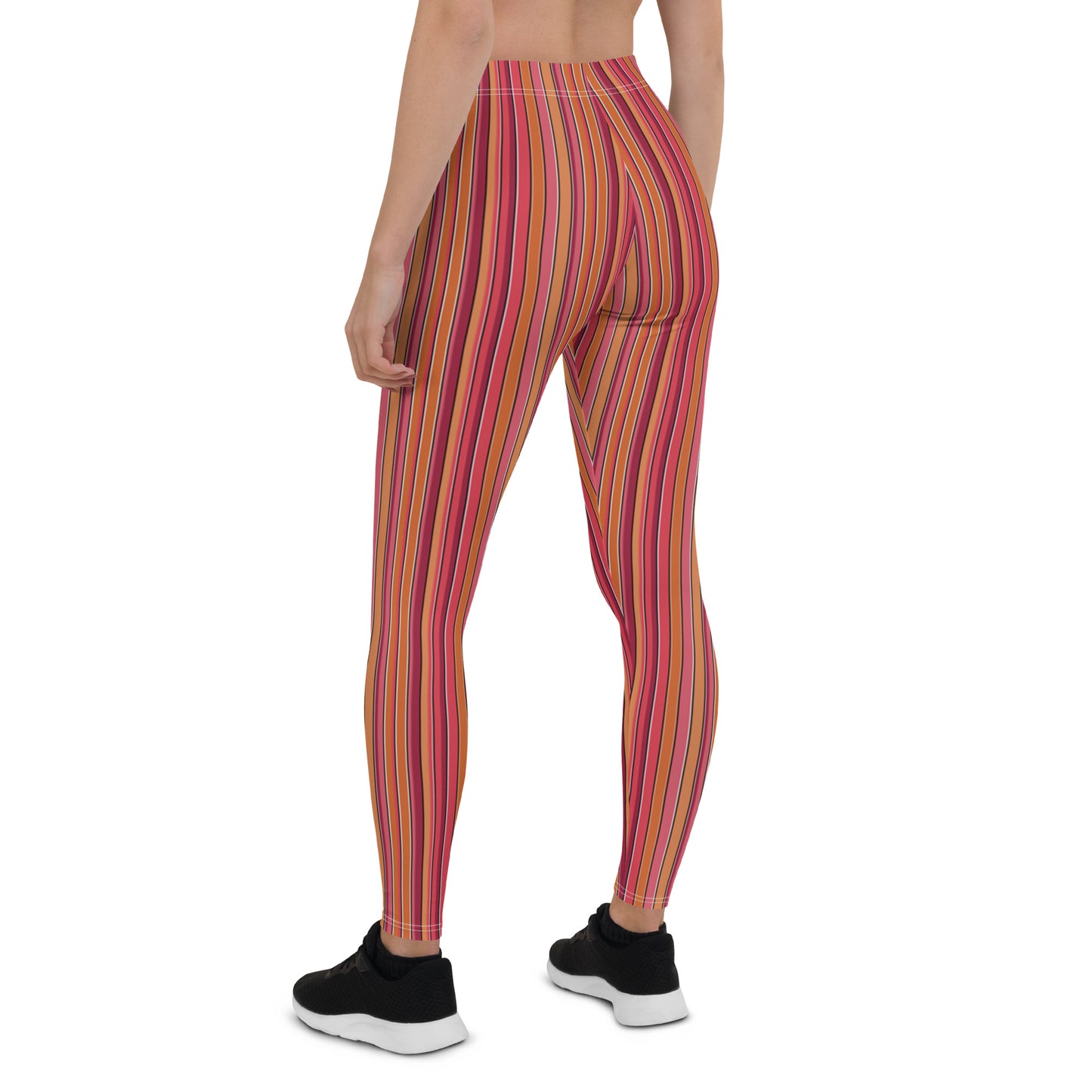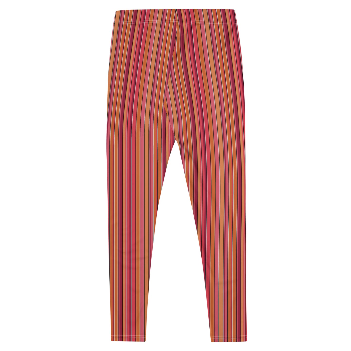 Brightly colored orange, pink and maroon leggings for women in a bold vertical color pattern. Fun 70s retro style running tights for women. Perfect soft and stretchy compression pants for gym, yoga, pilates, running, dancing, wrestling, frisbee throwing and more! Great festival meggings - would look rad at Burning Man. Wear your meggs with pride and make a statement in these fashion pants for women. Add for layering and a great retro punk vibe. Stay cool this season with our moisture wicking fabric that stretches perfectly with your body's contours.