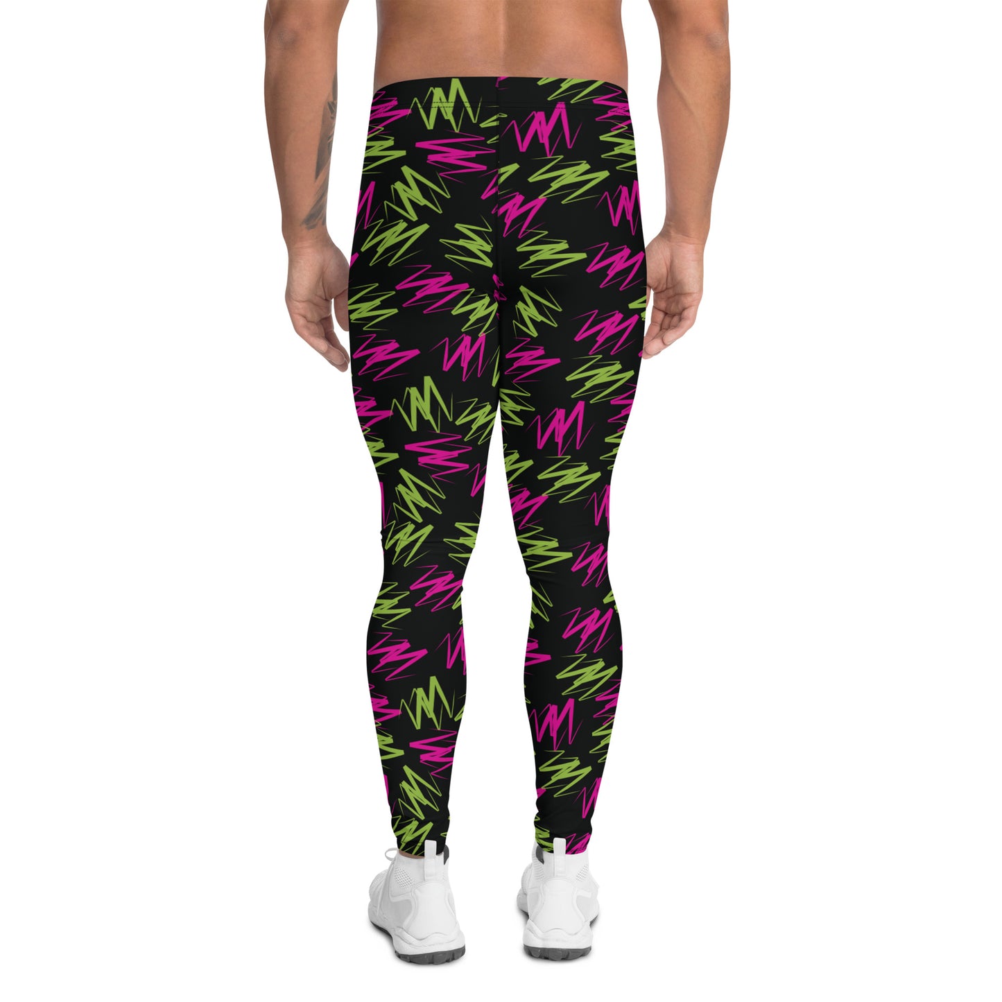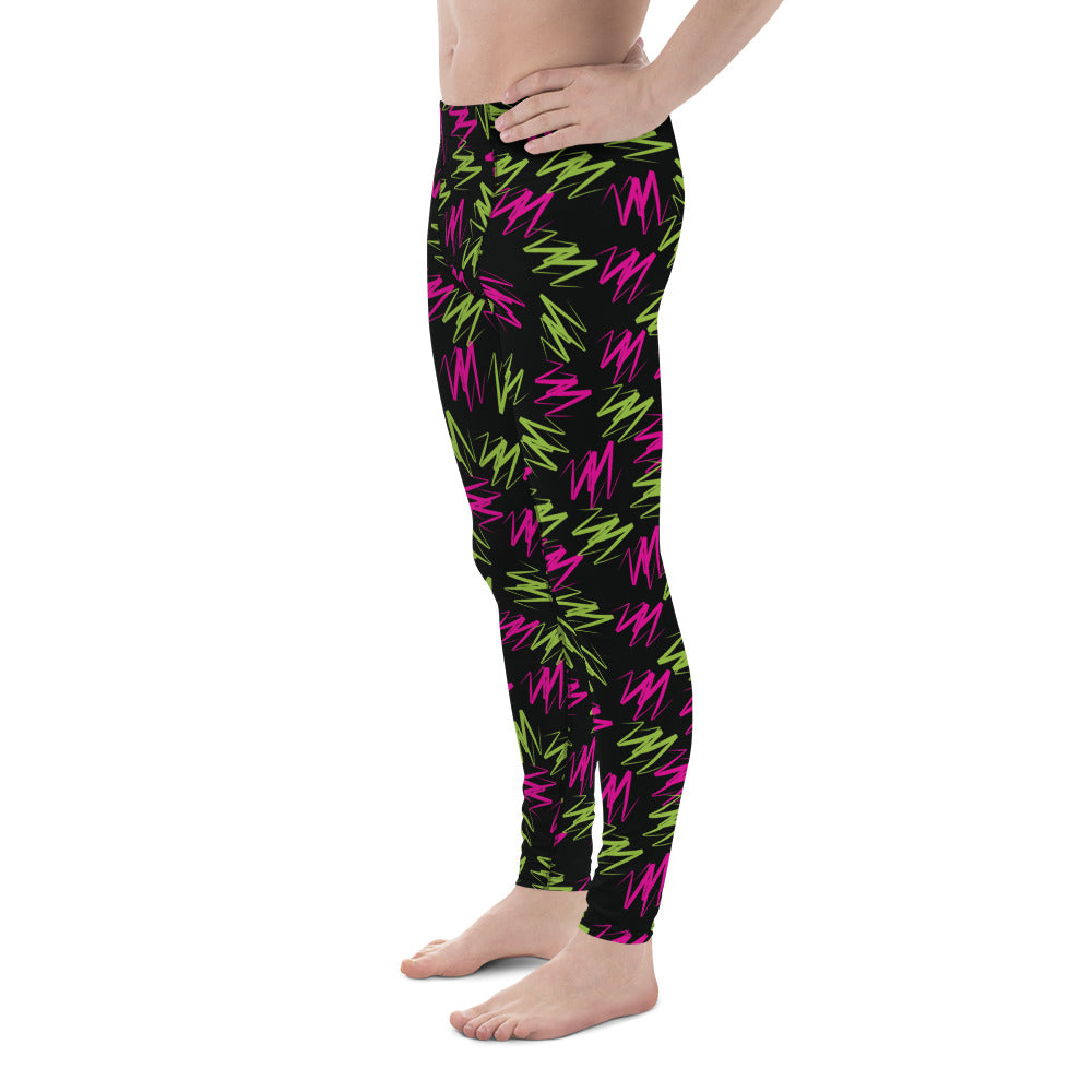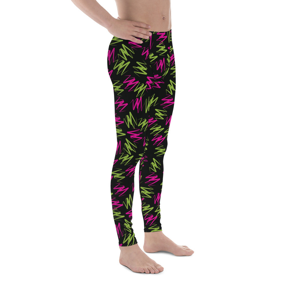 Awesome rainbowcore leggings for men with colorful zig zag design. Wear either as gym leggings, or as festival meggs for marches, parades and partying! Perfect for Burning Man. BJJ No GI spats of retro 80s pro-wrestling style leggings for the macho glam rock performer in you.