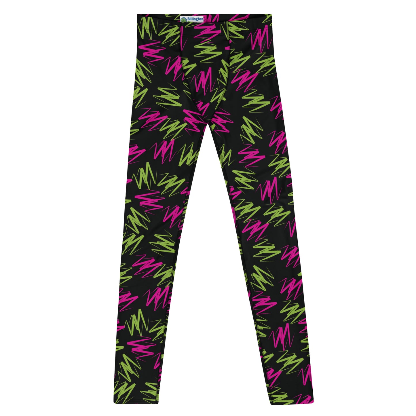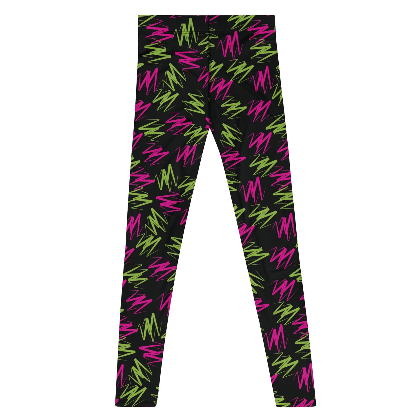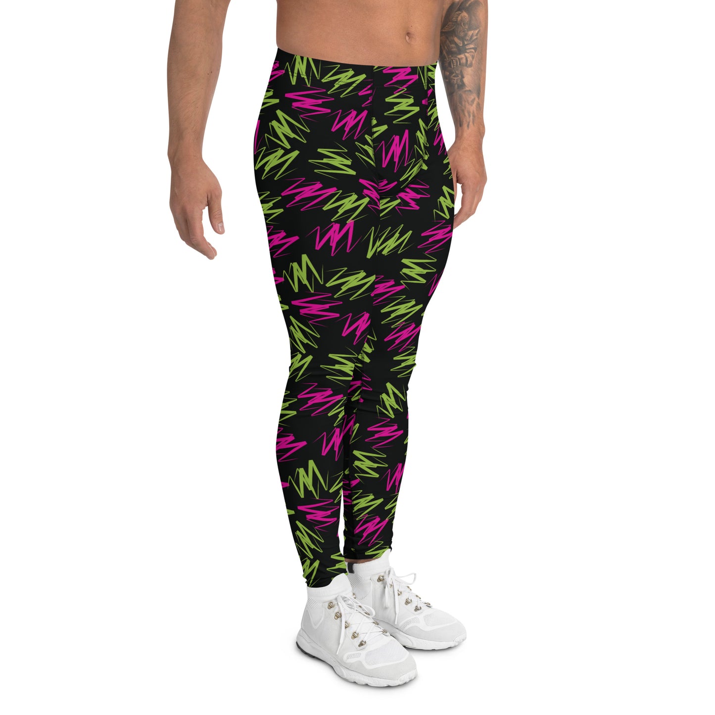 Awesome rainbowcore leggings for men with colorful zig zag design. Wear either as gym leggings, or as festival meggs for marches, parades and partying! Perfect for Burning Man. BJJ No GI spats of retro 80s pro-wrestling style leggings for the macho glam rock performer in you.