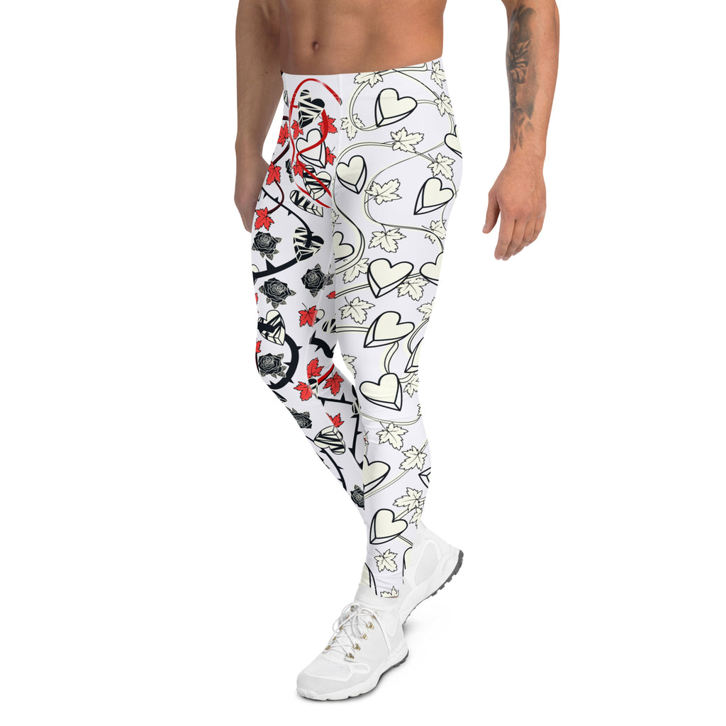 Rockstar style men's leggings in black and silvery white design, full of broken hearts, black roses and red vine leaves. Beautiful swirling vines and rose thorns entangle this heartbreak scene. Perfect stylish meggings for evenings out, as performance active sports, pro-wrestling, weightlifting, festival fashion or clubbing nights.