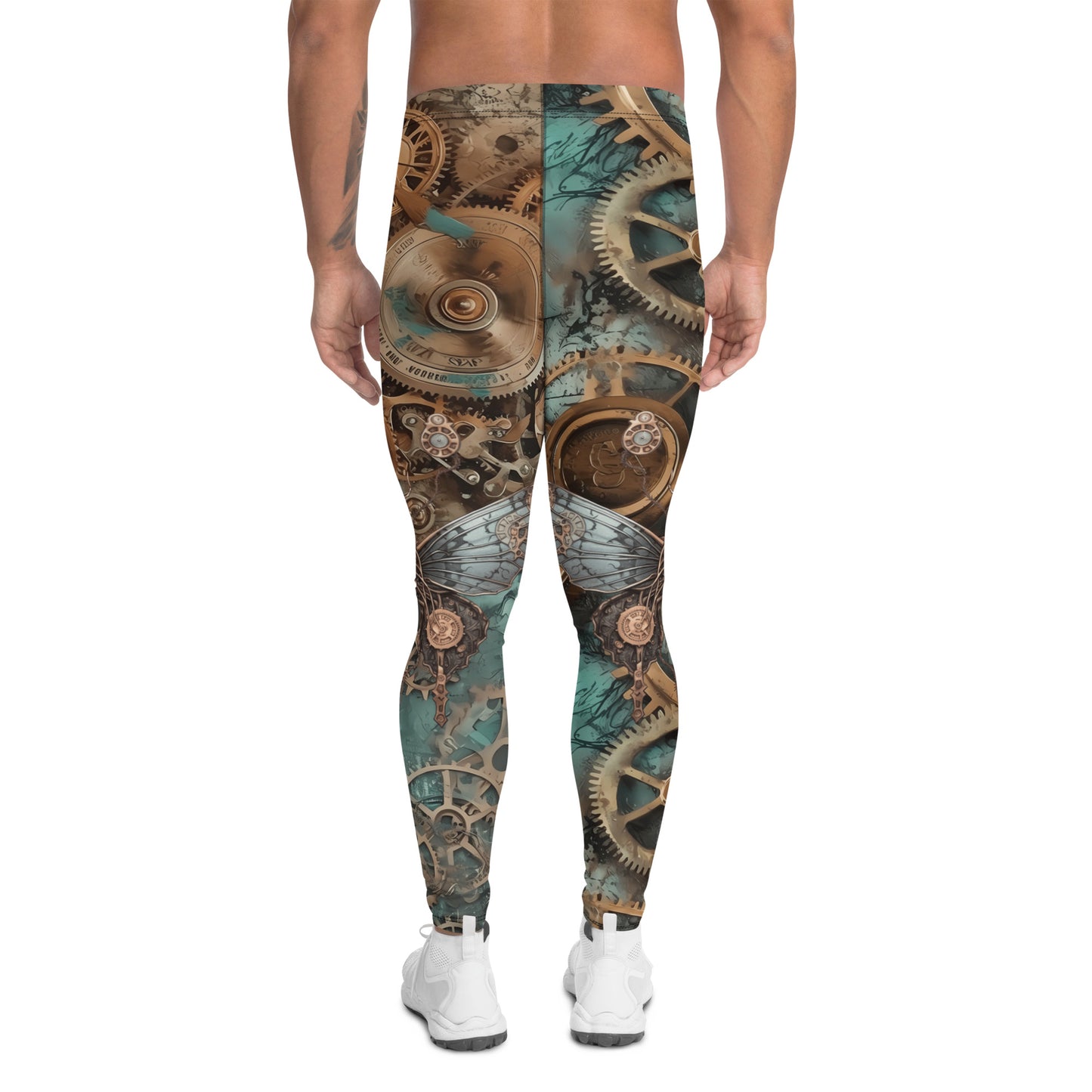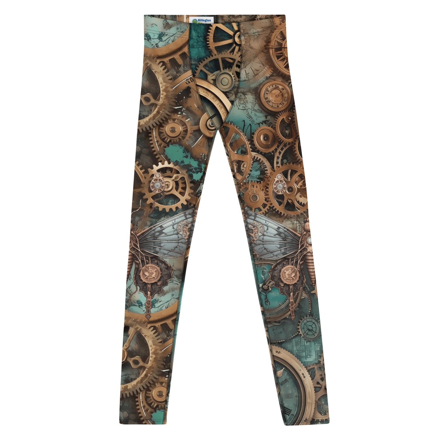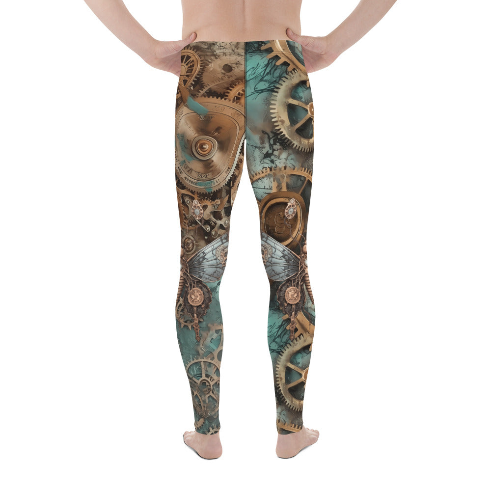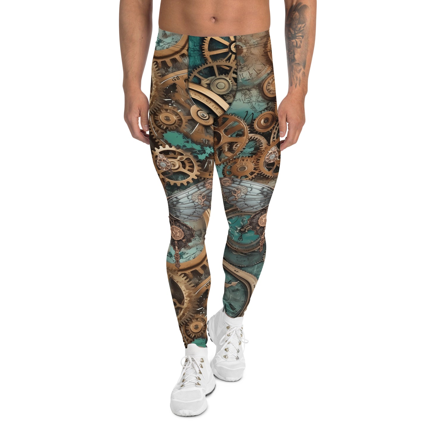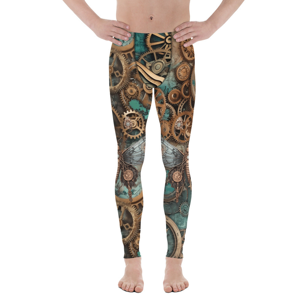 Retro steampunk leggings for men and horology fans. All-over clockwork patterned spandex leggings for guys who love sports and watches and wish to express an inner perpetual calendar geek. Try these cyberpunk fashion meggings by BillingtonPix. Steampunk and Around the World in 80 Days vibes. Be your own Jules Verne and sport the ultimate in watch geek fashion.