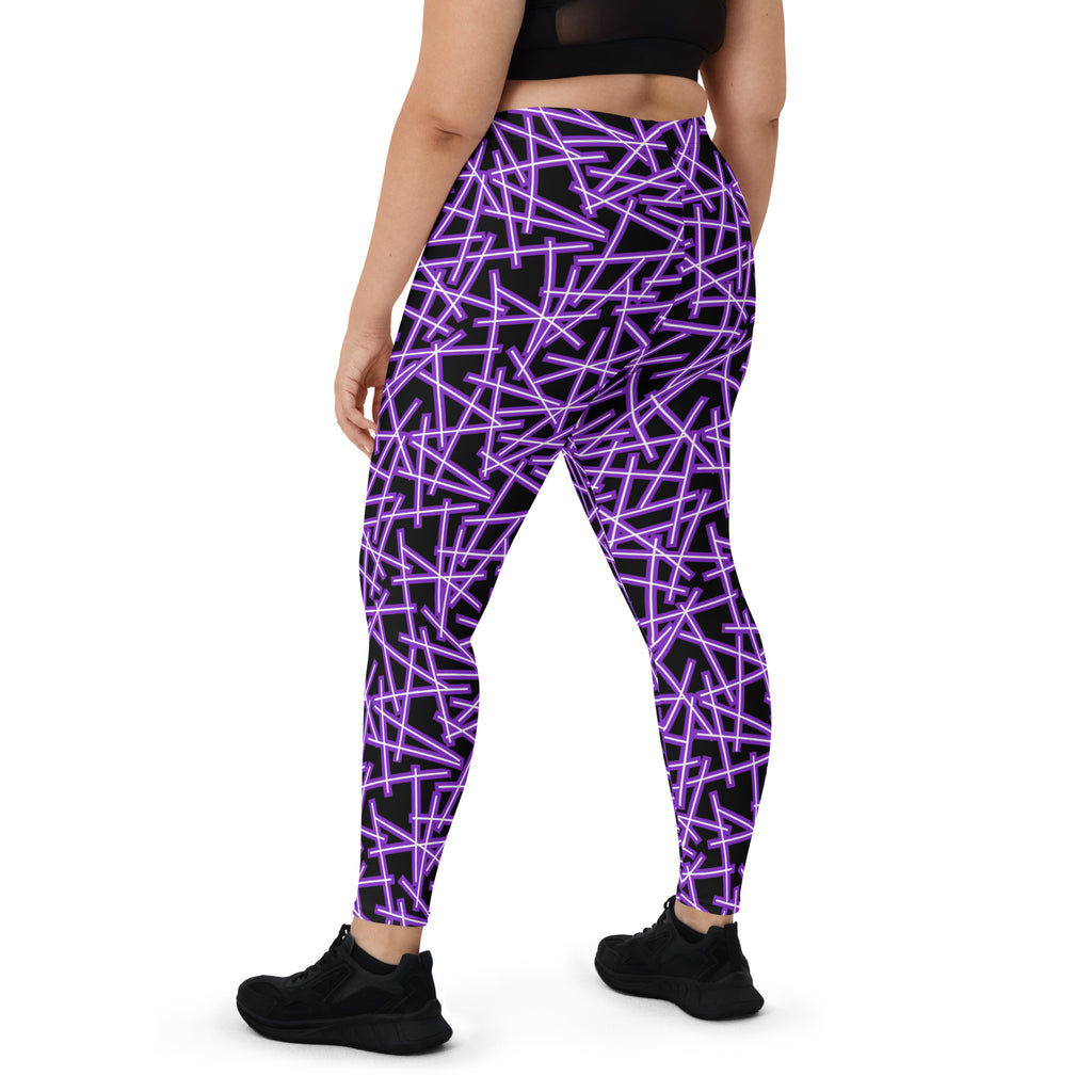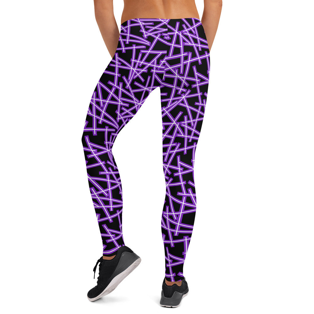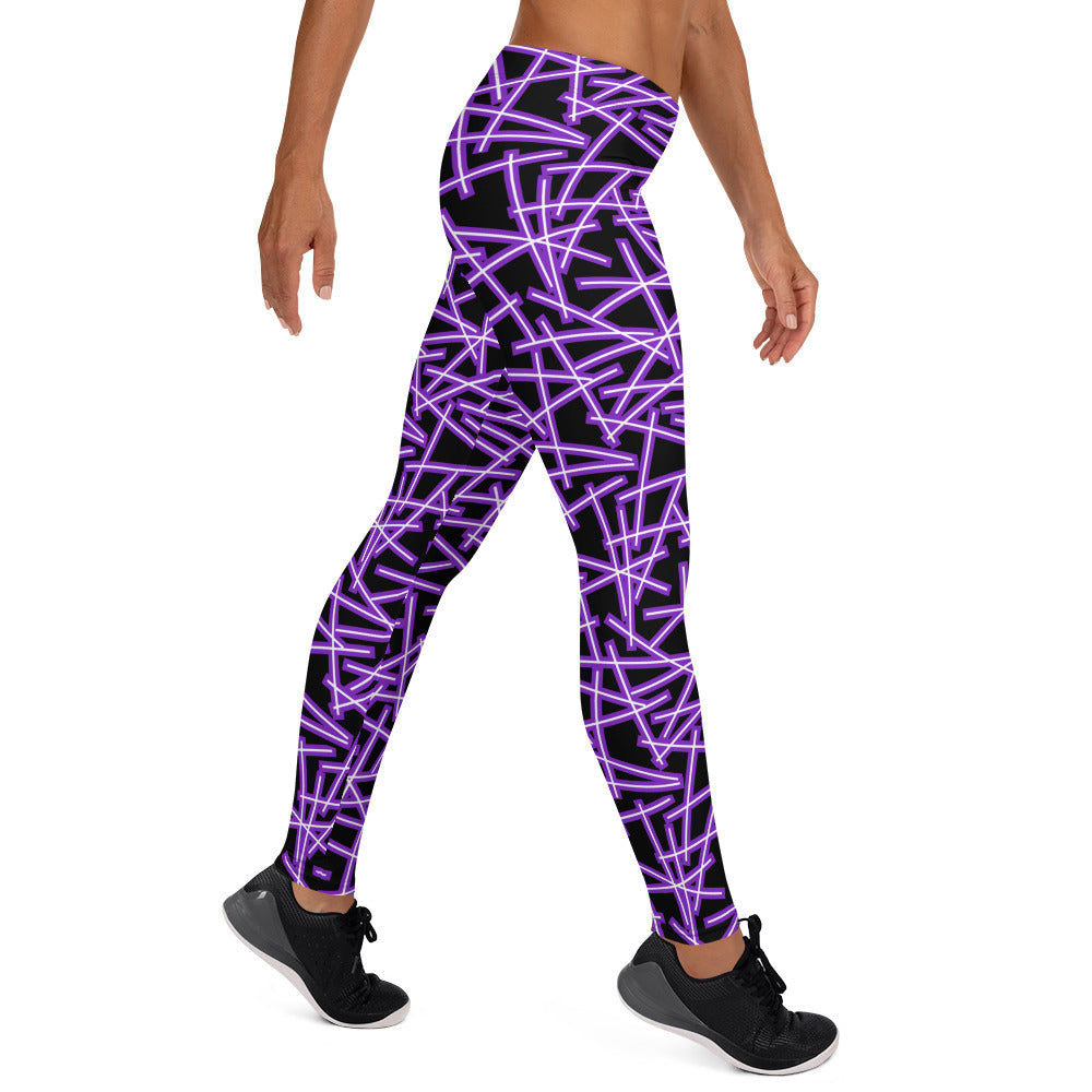 Women's fashion leggings and running tights in a colorful Neoncore retro geometric print pattern. Perfect festival meggings for women in bold purple neon effect stripes against a black background. Athleisure for women at the gym to impress or as striking streetwear, cosplay or unique party outfits. Hand sewn all-over print design with UPF sun protection as standard.
