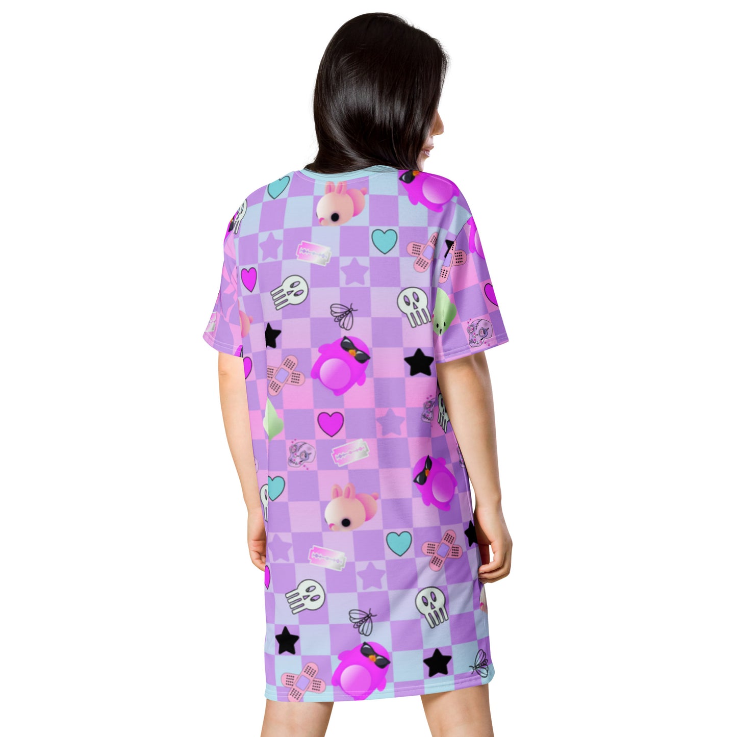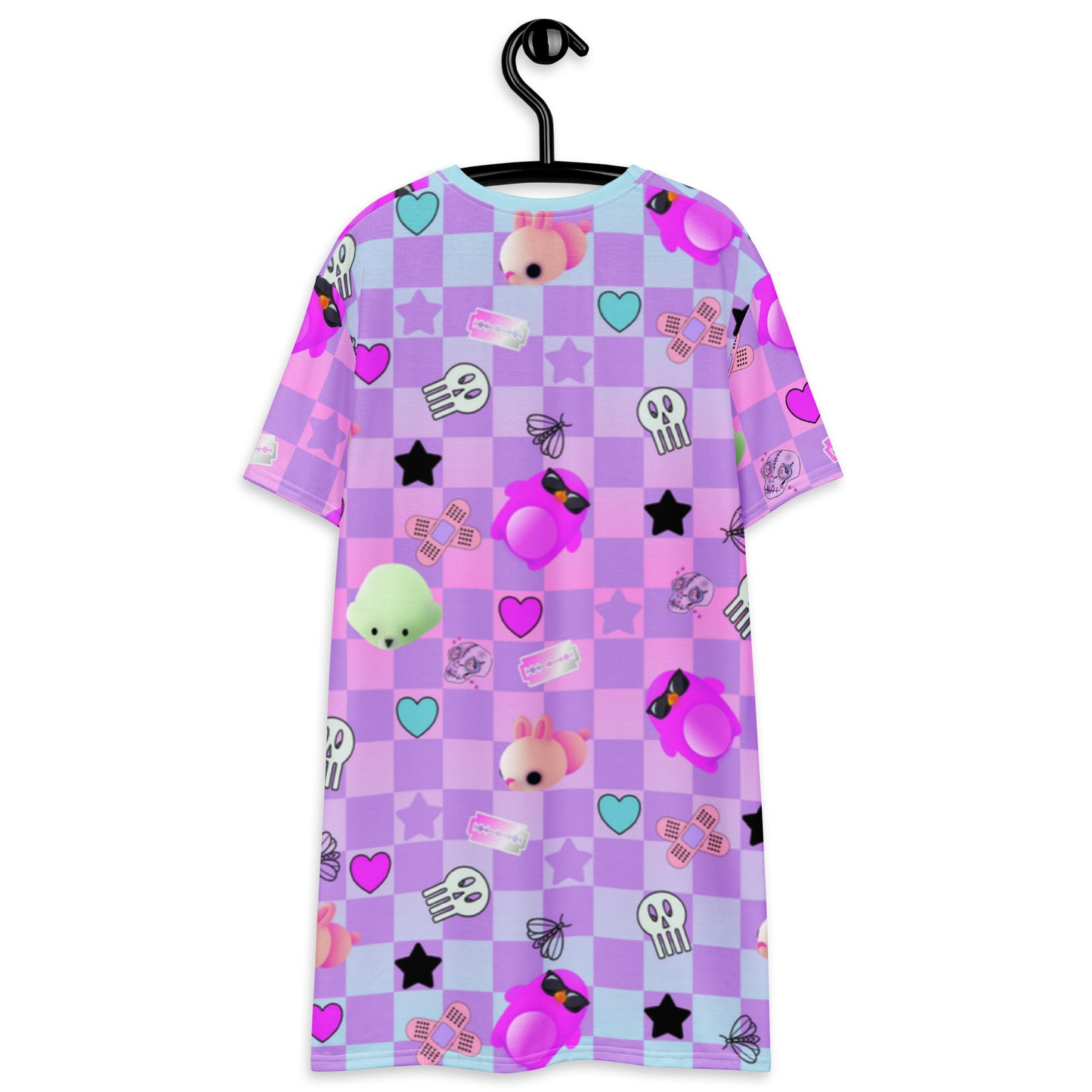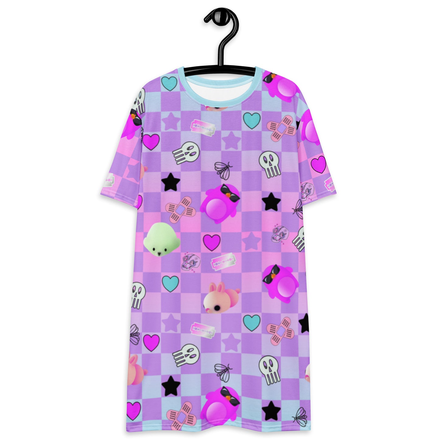 If you're looking for Menhera Dresses then how about this Pastel Goth anime tee shirt dress for women? With a checked background of pastel blue with a neon vibe and pink with standout anime characters and Yami Kawaii motifs. Menhera Kei graphics of skulls, moths, sticking plasters and black stars mingle with cute Yume Kawaii symbols of mochi seals, penguins and hearts. This vibrant patterned t-shirt dress is perfect for your Harajuku alt fashion look.