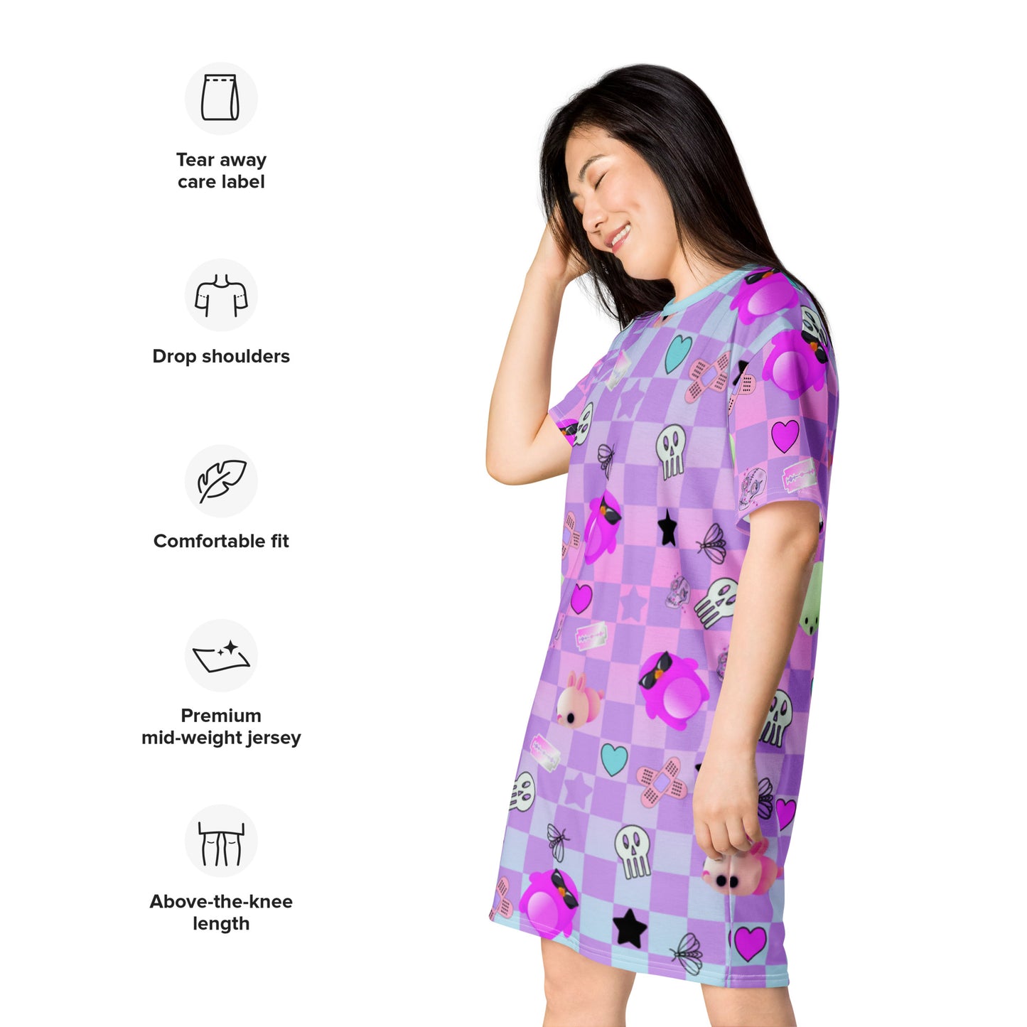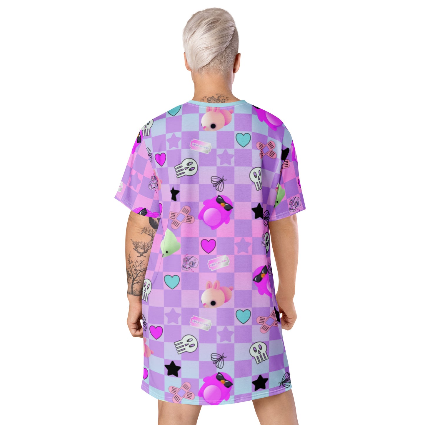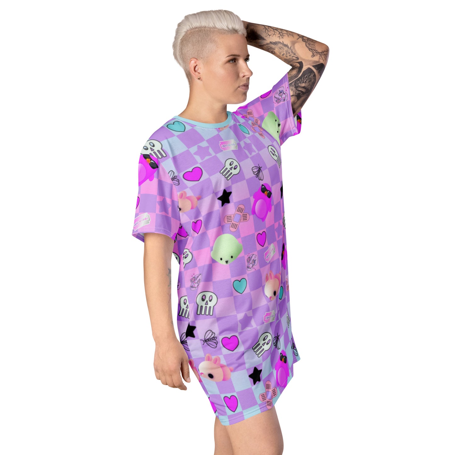 If you're looking for Menhera Dresses then how about this Pastel Goth anime tee shirt dress for women? With a checked background of pastel blue with a neon vibe and pink with standout anime characters and Yami Kawaii motifs. Menhera Kei graphics of skulls, moths, sticking plasters and black stars mingle with cute Yume Kawaii symbols of mochi seals, penguins and hearts. This vibrant patterned t-shirt dress is perfect for your Harajuku alt fashion look.