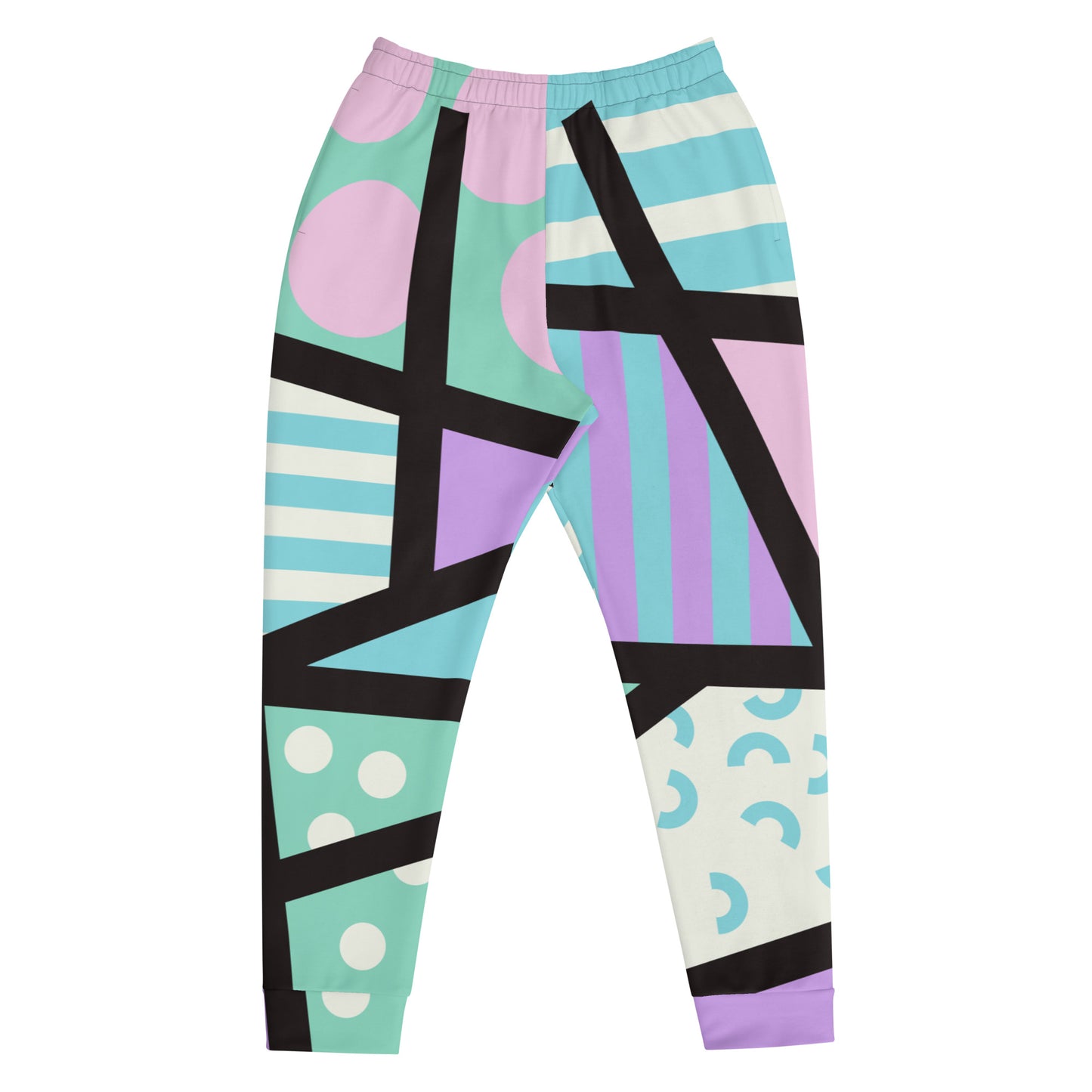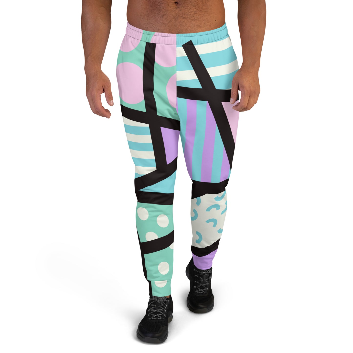 Our stylish retro 80s Memphis style multicoloured geometric soft style sweats for men are on point! Perfect athleisure clothing for jogging, running, squatting, casual lunching, Harajuku street style fashion or simply as loungewear sports clothing. These tight fit joggers for men flatter the body shape perfectly. Gorgeous pastel tones in a vibrant all-over large size pattern with a black geometric outline overlay.
