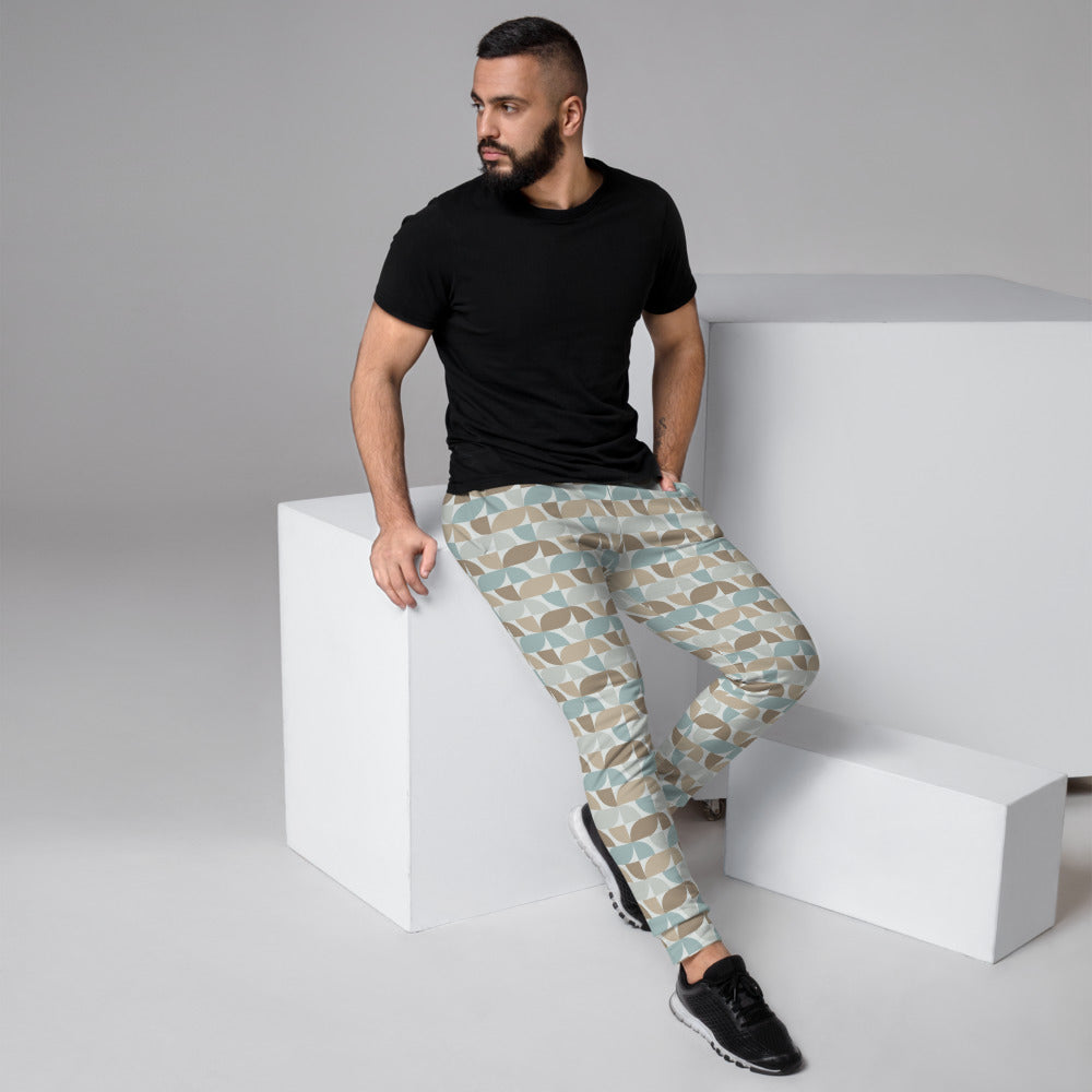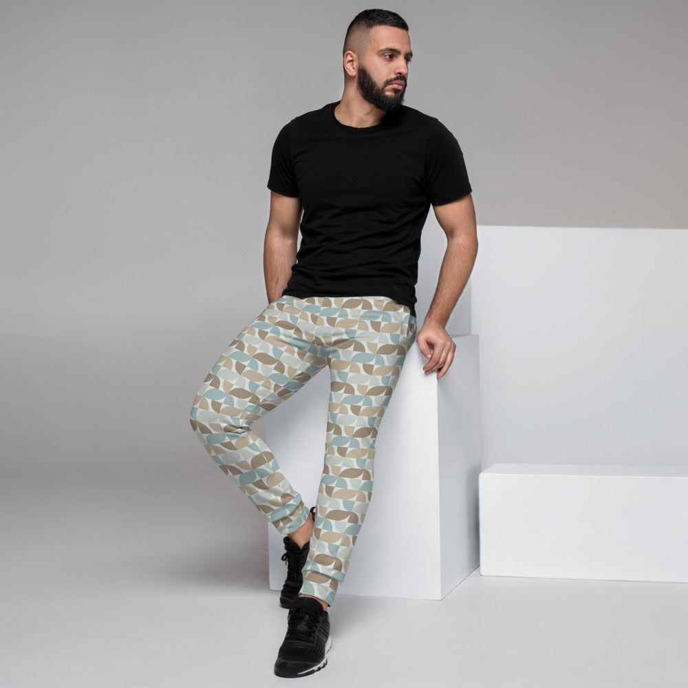Beautifully stylish men’s joggers, or sweatpants in a geometric 80s and Russian Mid-Century Modern inspired style, pastel colour design. Free shipping to most destinations. Perfect either for the gym, comfortable loungewear or as streetwear fashion apparel.