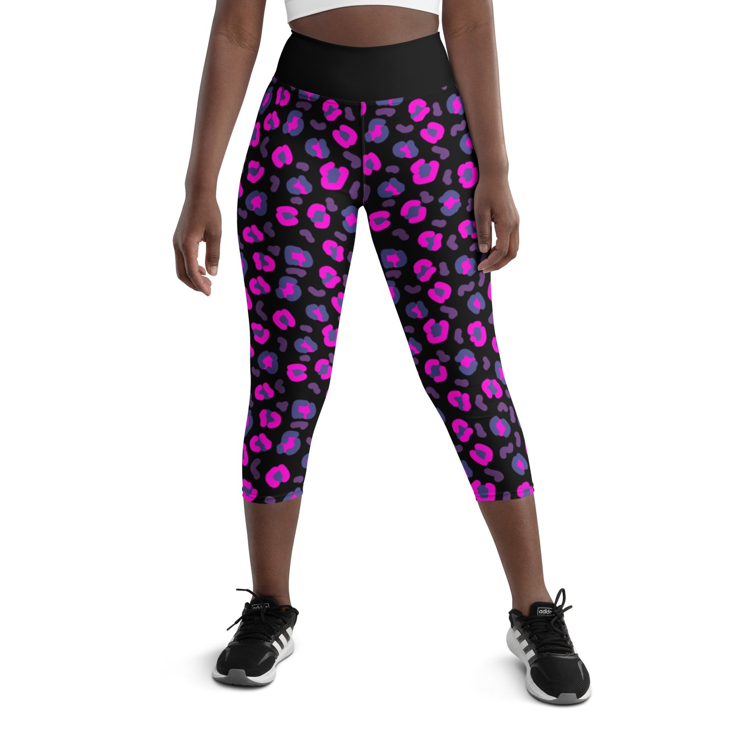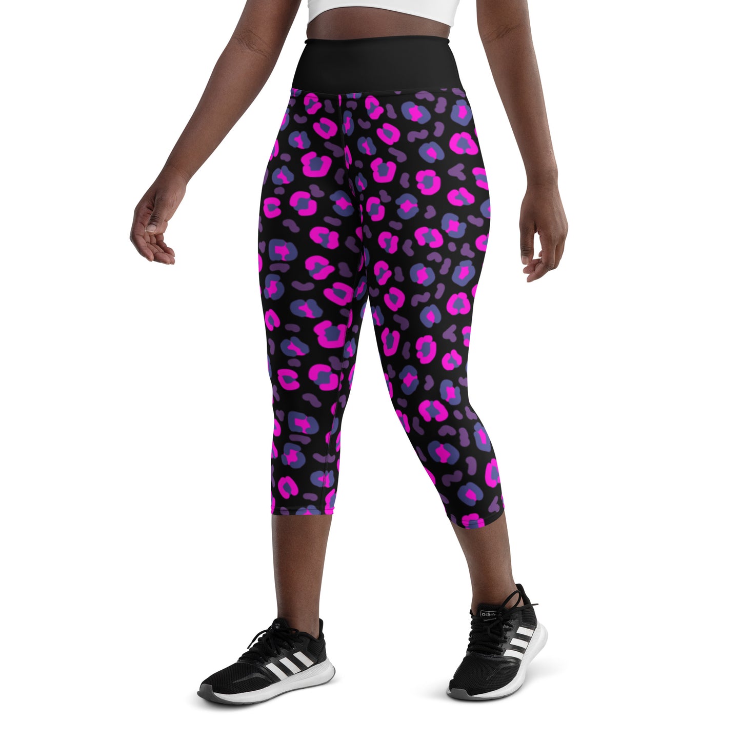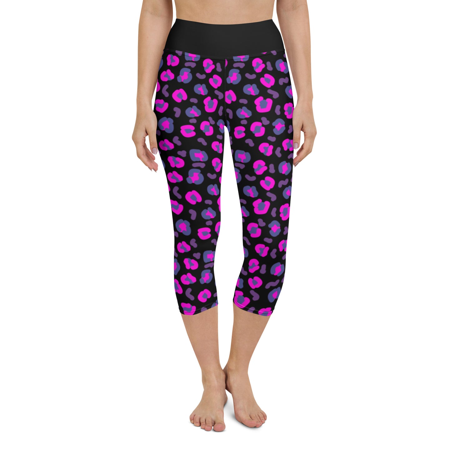 Colorful pink leopard skin style yoga capri leggings for women in a retro 80s rocker style and colour tones with black elastic waistband for added comfort. Pockets included.