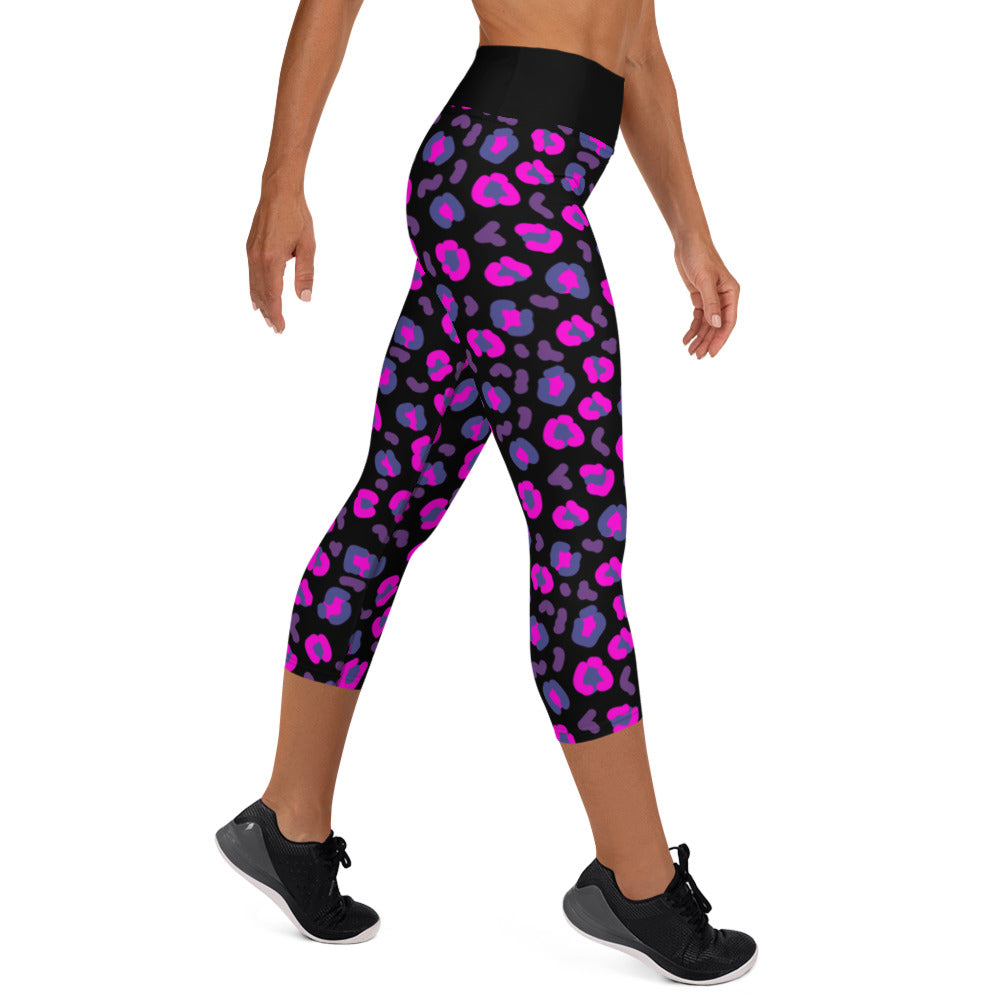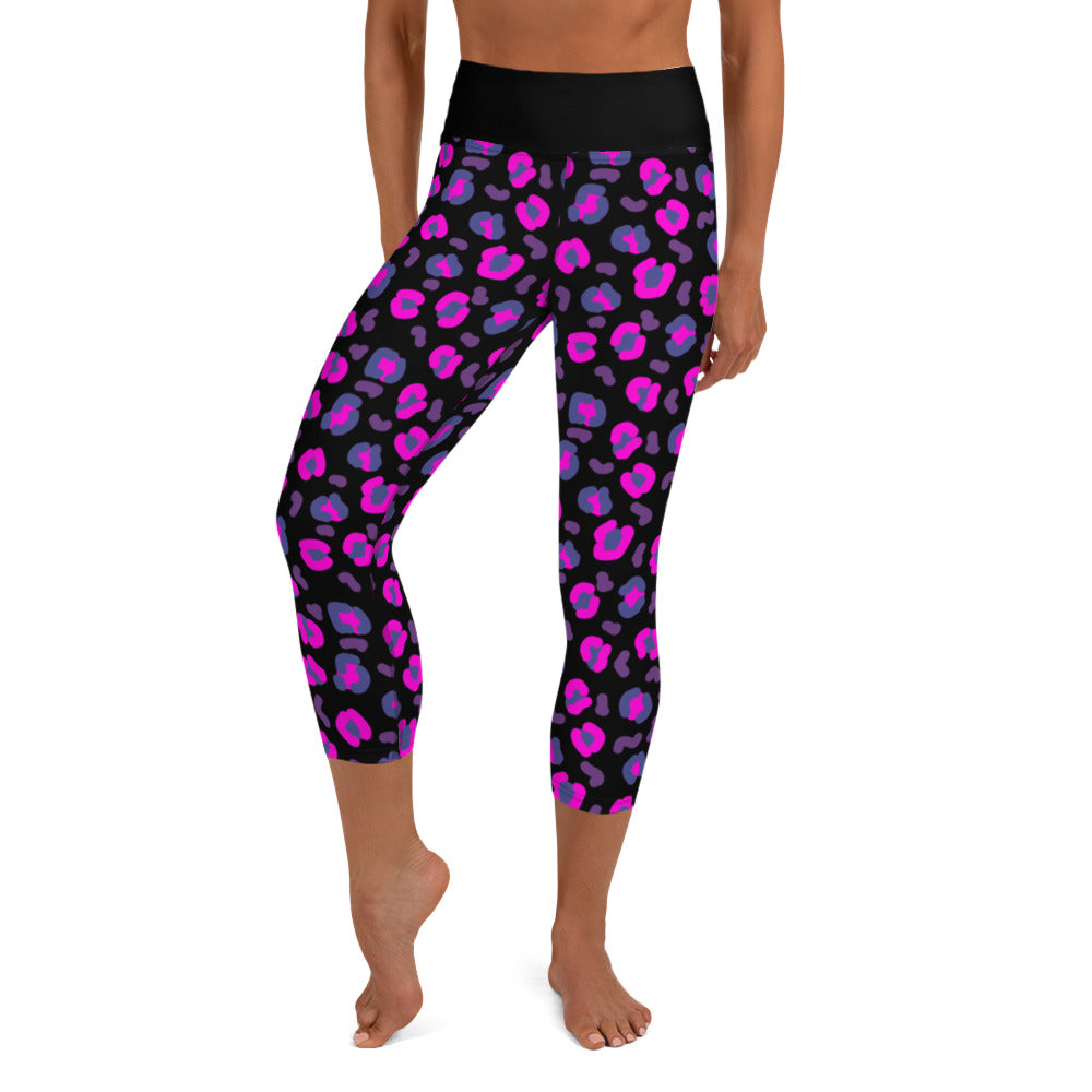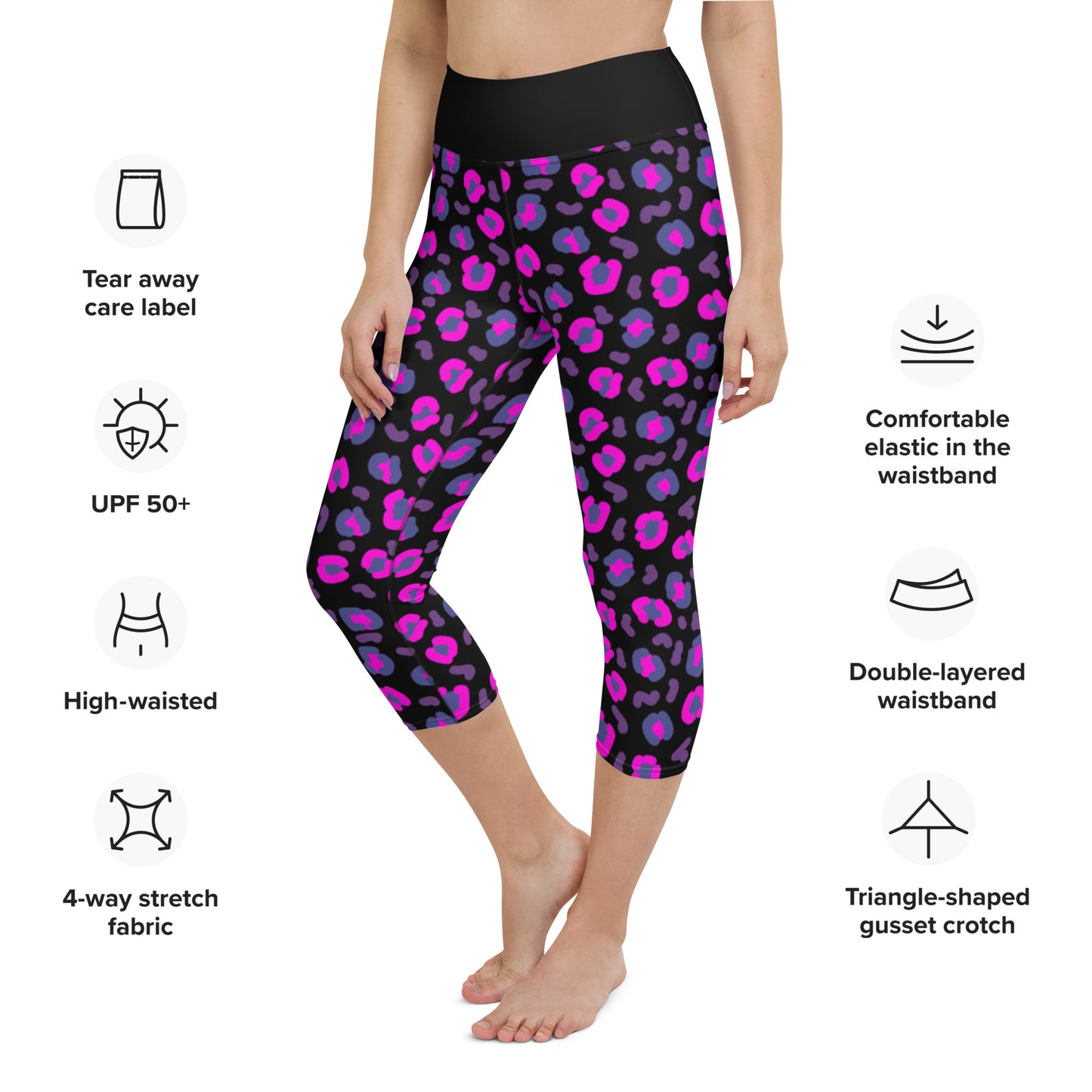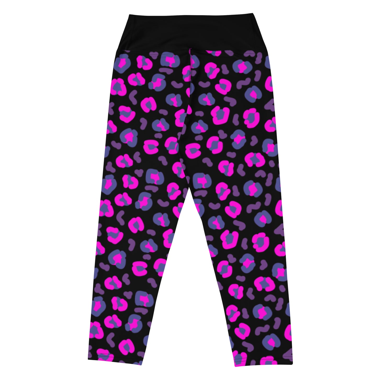 Colorful pink leopard skin style yoga capri leggings for women in a retro 80s rocker style and colour tones with black elastic waistband for added comfort. Pockets included.
