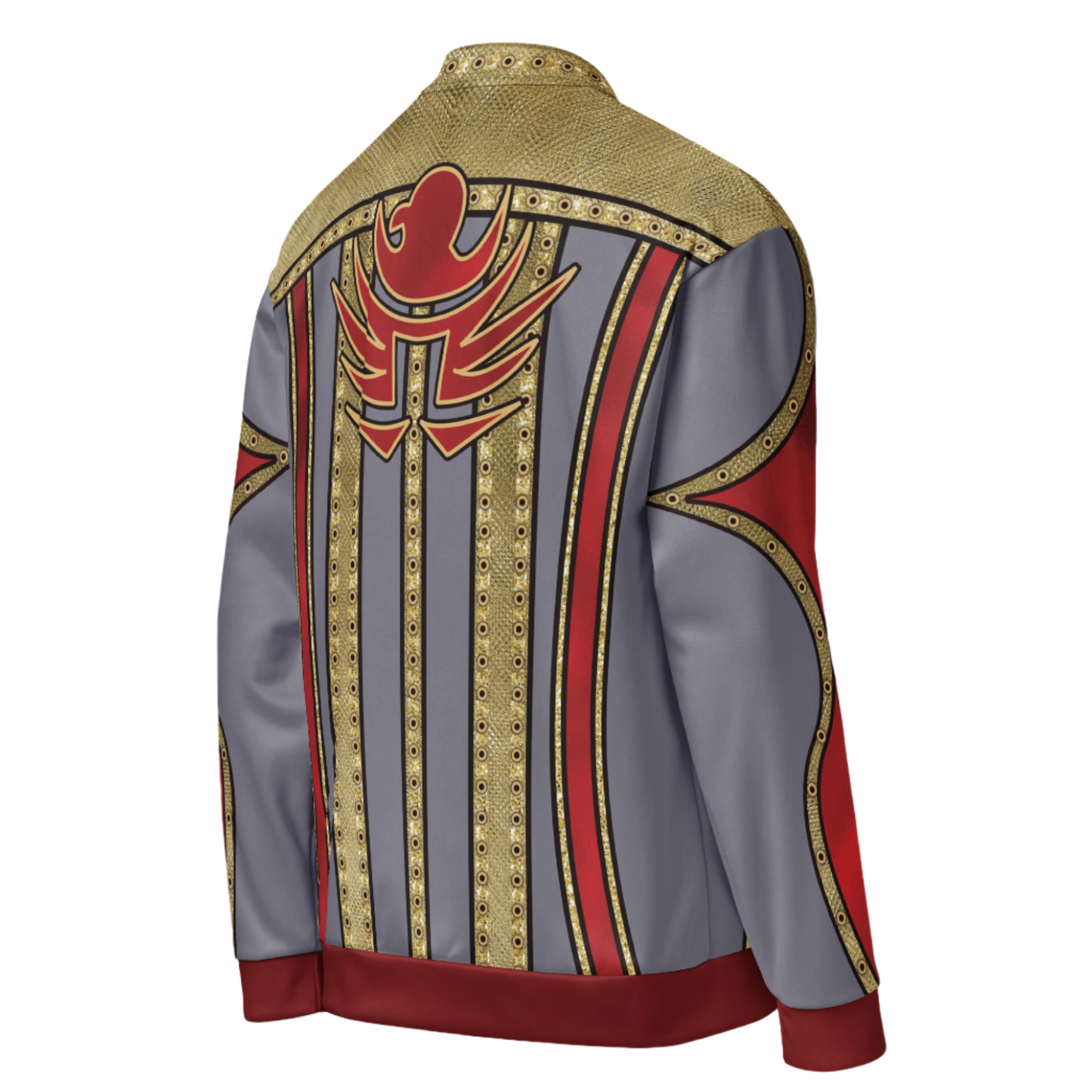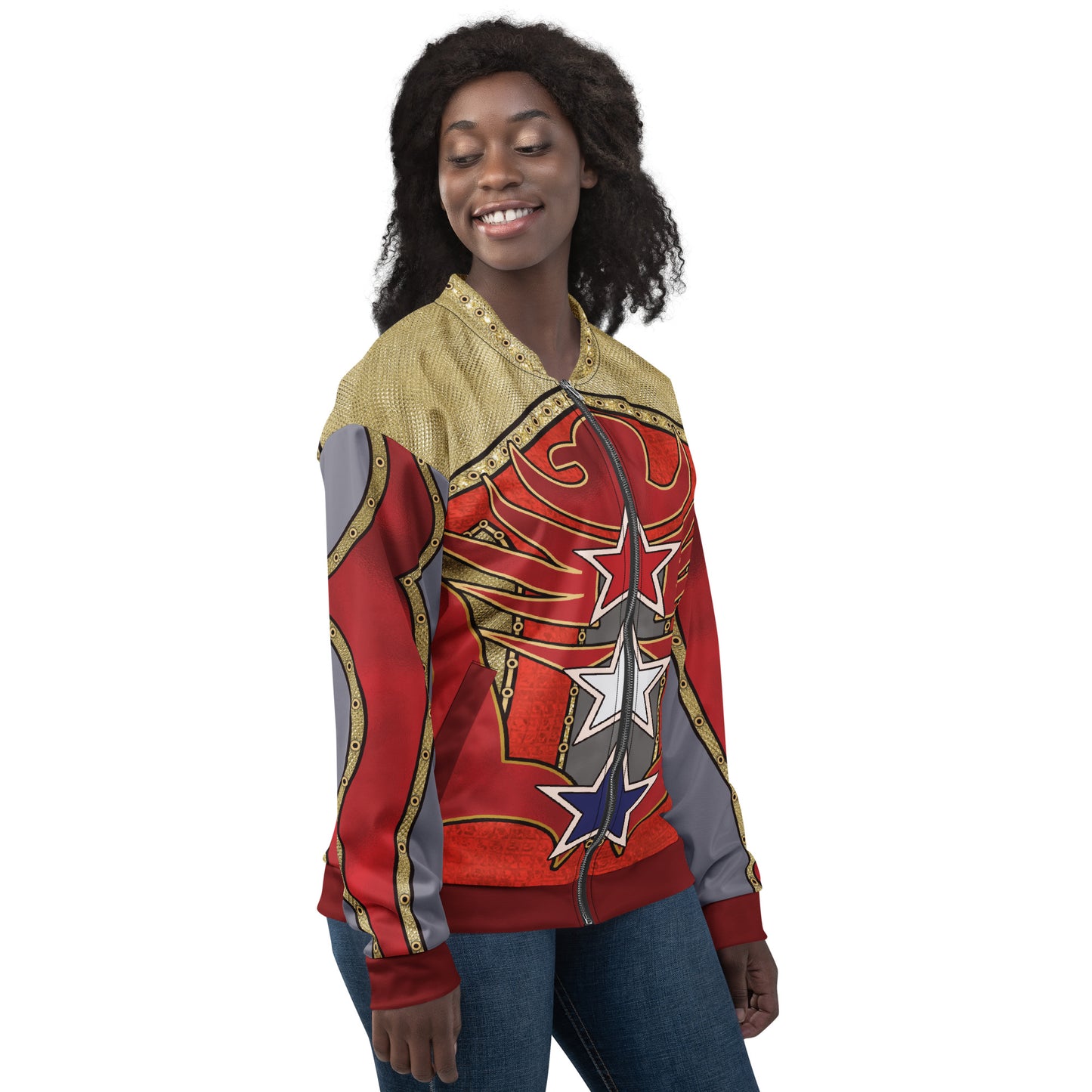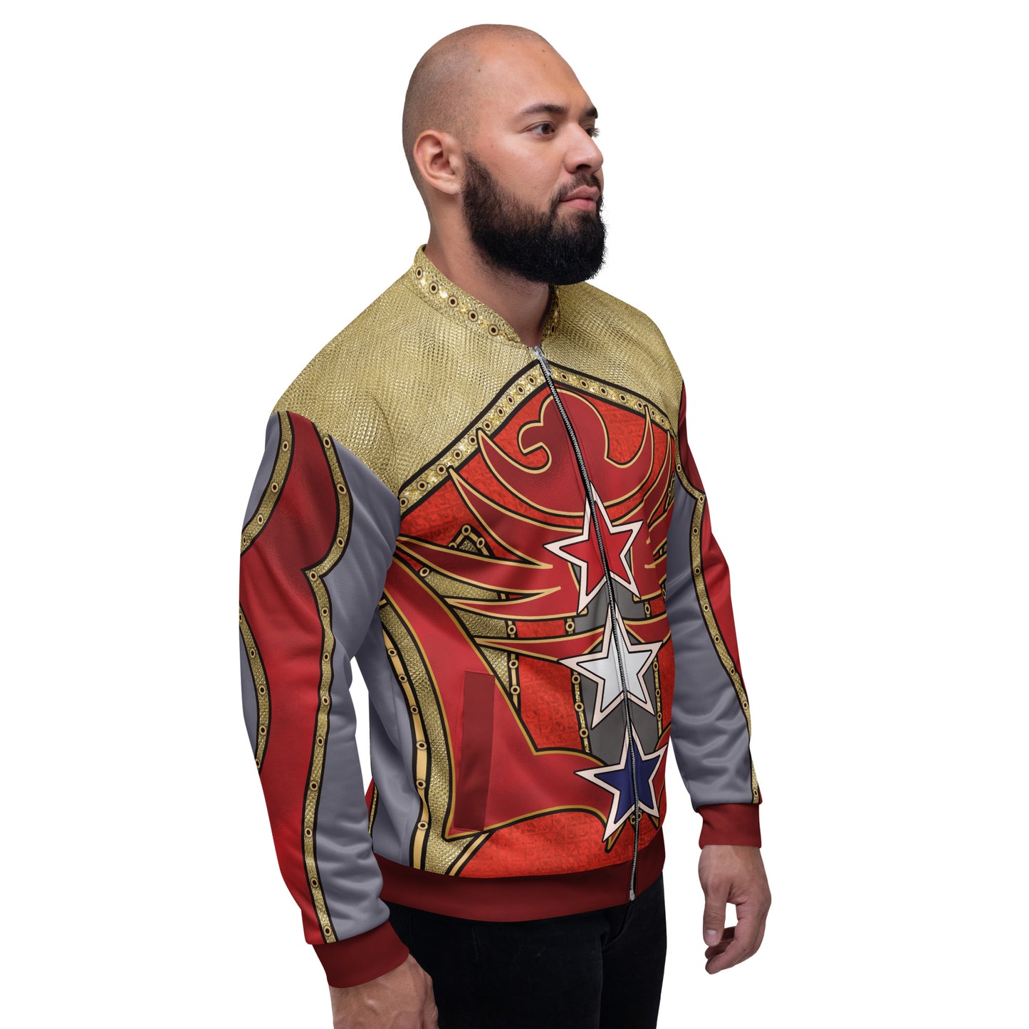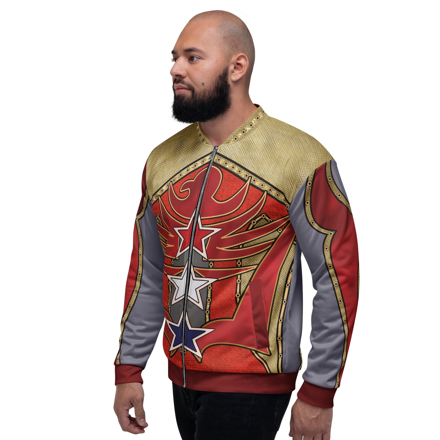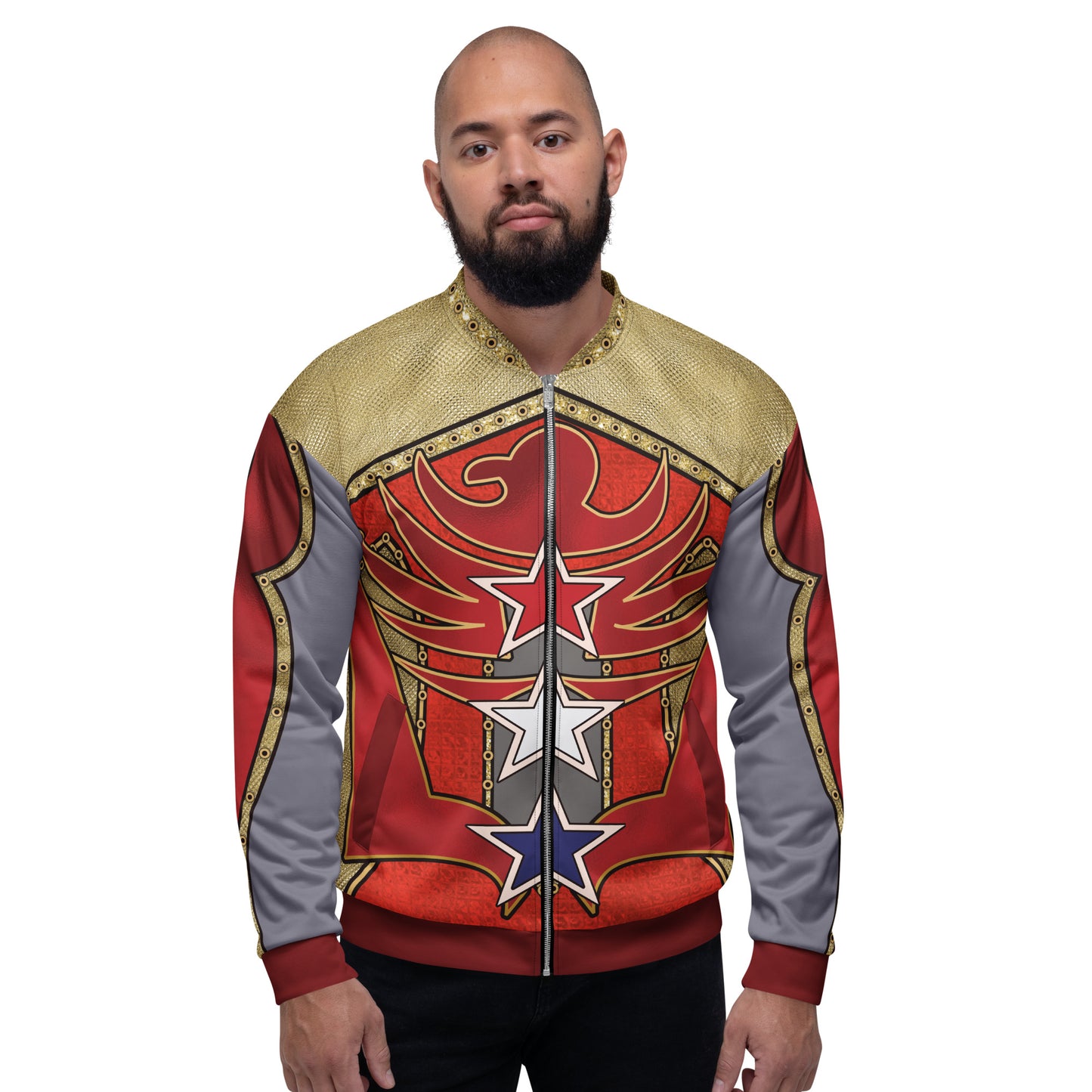 Champion bomber jacket for wrestling hero followers, cosplayers or simply for street fashion. Red, gold and grey with eagle design. Fits sizes XS to 3XL.