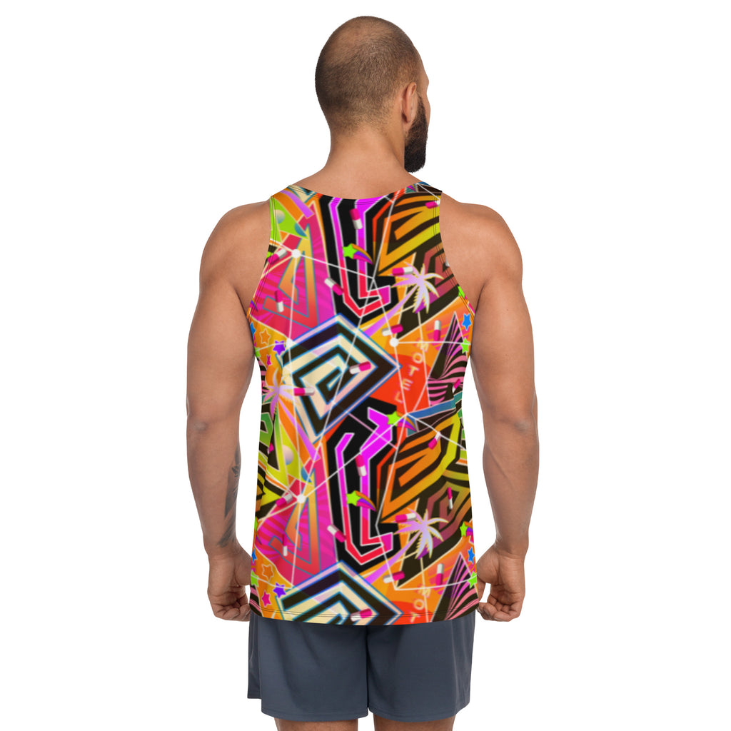Unique men's tank top in orange and pink in a perfect mashup of Vaporwave and Menhera Kei aesthetic. Vibrant and smooth sports vest for men that is versatile to wear to parties, raves, clubs and festivals as well as the gym and as part of your running gear. Beautiful geometric shapes in a futuristic vision of Las Vegas with palm trees and neon signage, sprinkled with a cascade of kawaii pills in a nod to the Menhera Kei aesthetic. With Yami Kawaii and Harajuku influences, this Synthwave rave and cosplay outfit is a great choice for your Jfashion look. The stretchy and smooth fabric keeps its color and means that this mens top is versatile for either the gym, dance, running or as fashion, street, festival or rave wear. This tank is popping and is the perfect look for the self-expressive man.