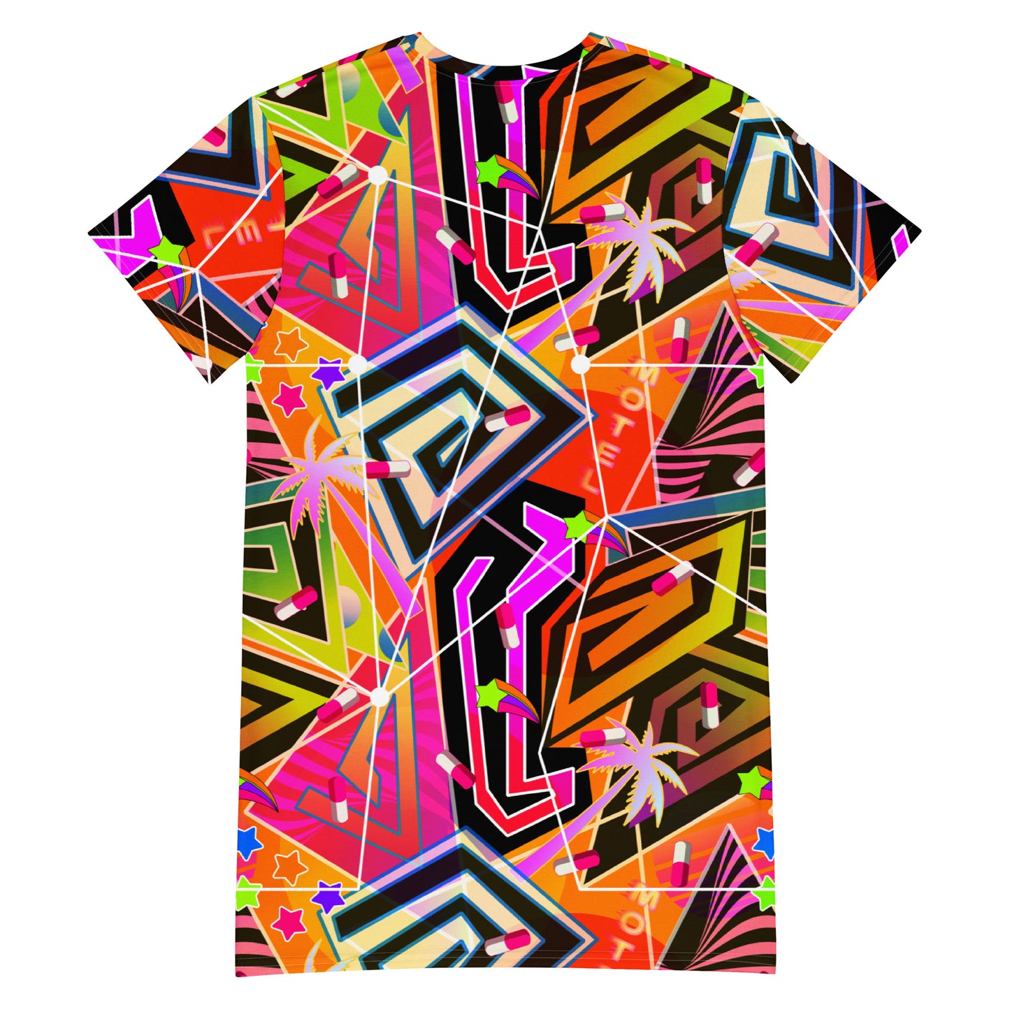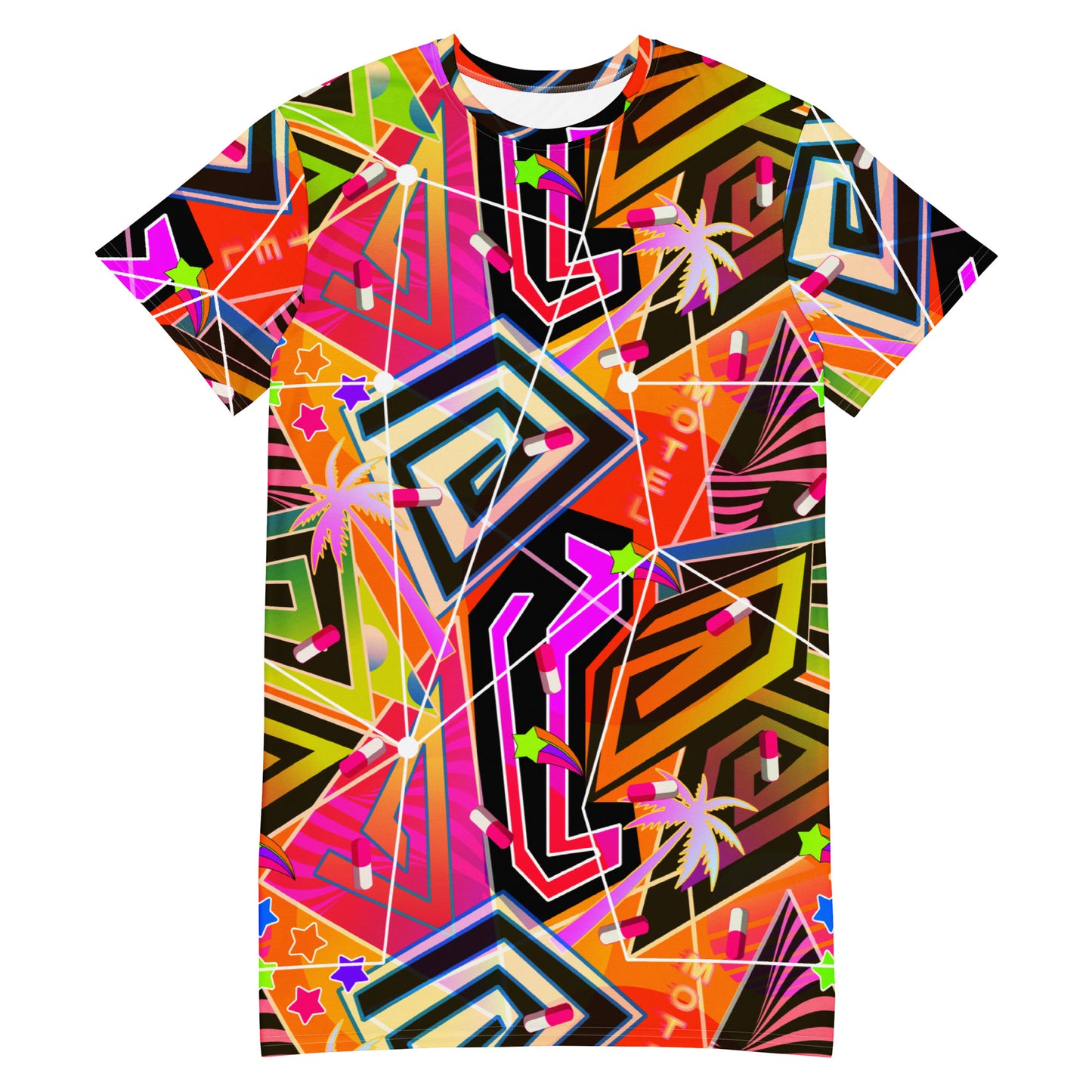 Multipurpose t-shirt dress in geometric Vaporwave shapes with Neoncore Las Vegas references such as palm trees, signage and stars. Play out your Vaporwave Harajuku aesthetic in style with the ultimate in versatility. Style it either casual with leggings and sneakers or dressed up with a jacket. Wear your shirtdress for bedtime or for hitting the right look in your streetwear wardrobe collection. With a comfortable oversize fit it is going to send out the perfect message this season.
